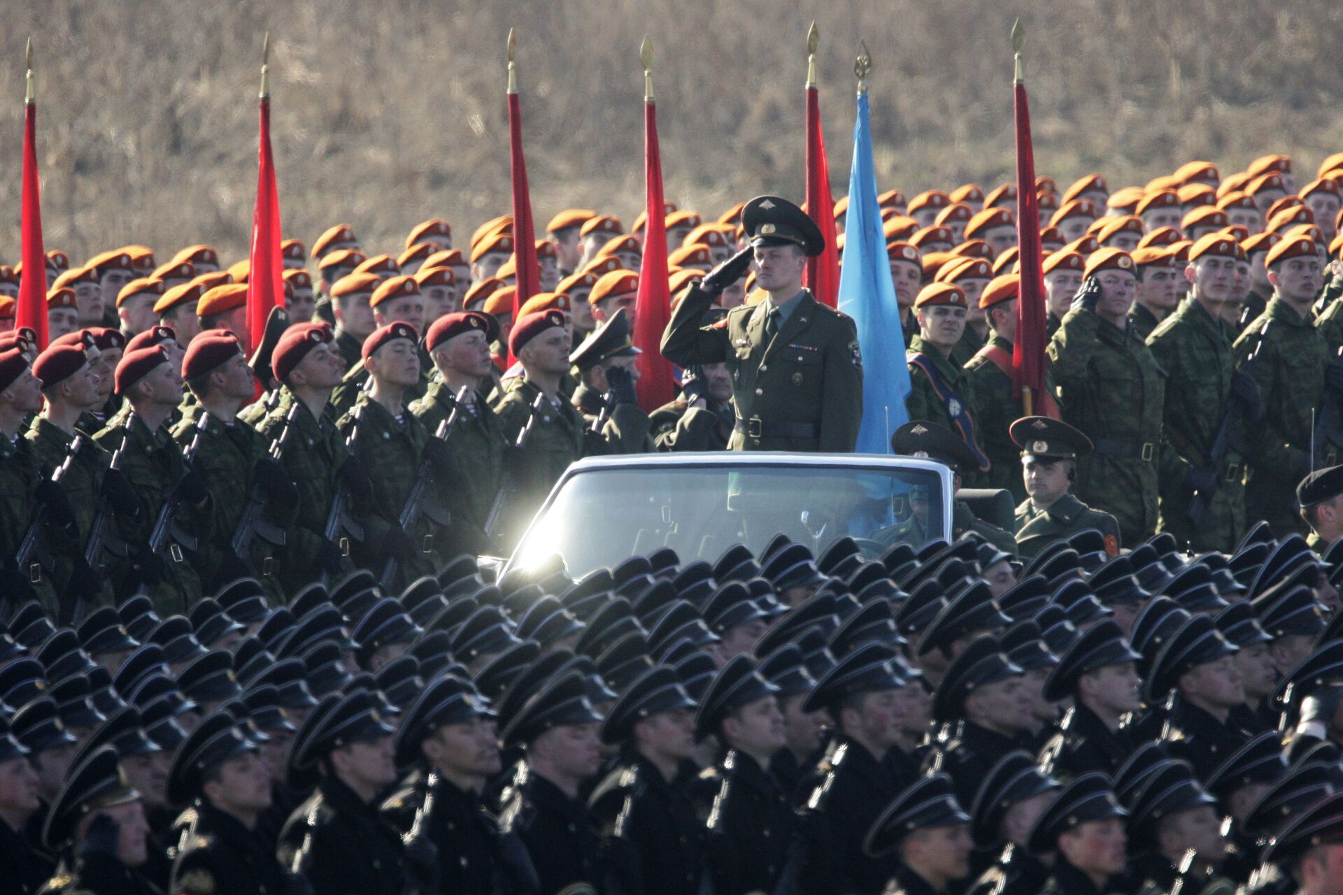 Une répétition de la parade du 9 mai qui marquera le 65e anniversaire de la Victoire de la Seconde Guerre mondiale s'est déroulée le 13 avril sur le polygone d'Alabino, au sud-ouest de Moscou. Sur la photo: un régiment de la Marine de guerre lors de la répétition de la Parade.