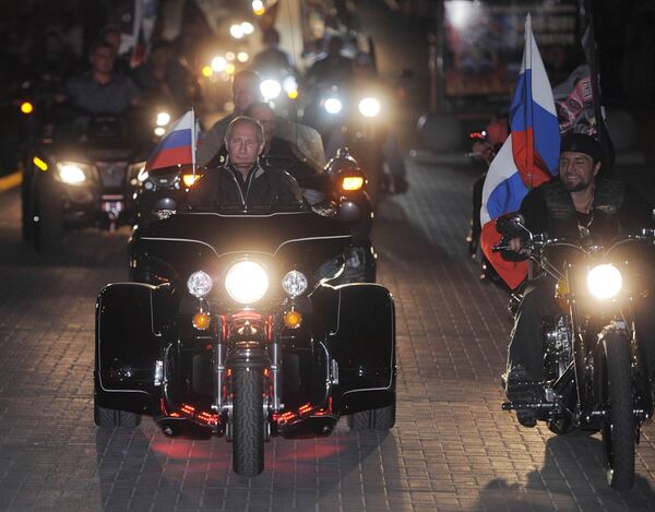 Le premier ministre russe Vladimir Poutine est arrivé à Novorossiïsk pour assister au 16 festival de motards, organisé par l'association Loups de la nuit. Comme il se doit pour un vrai motard, le chef du gouvernement portait une veste noire et des gants en cuir.