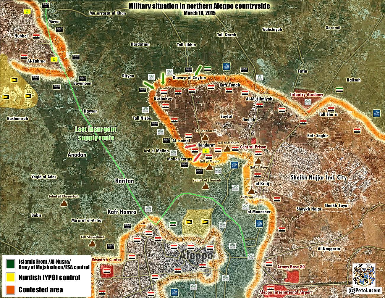Il y a ensuite eu l'échec de l'opération militaire gouvernementale de février 2015 qui visait à terminer l'encerclement d'Alep. Après l'échec de cette opération la ville reste quasiment encerclée (comme on peut le voir sur cette carte) mais cet épisode a sans doute eu un impact psychologique négatif pour l'armée gouvernementale qui surfait sur une vague de succès jusque-là. A l'est de la ville, dans la zone sous contrôle de l'Emirat Islamique, une base militaire gouvernementale (Kuweyres) est en outre totalement encerclée et soumise aux assauts quotidiens des kamikazes de l'Emirat islamique.