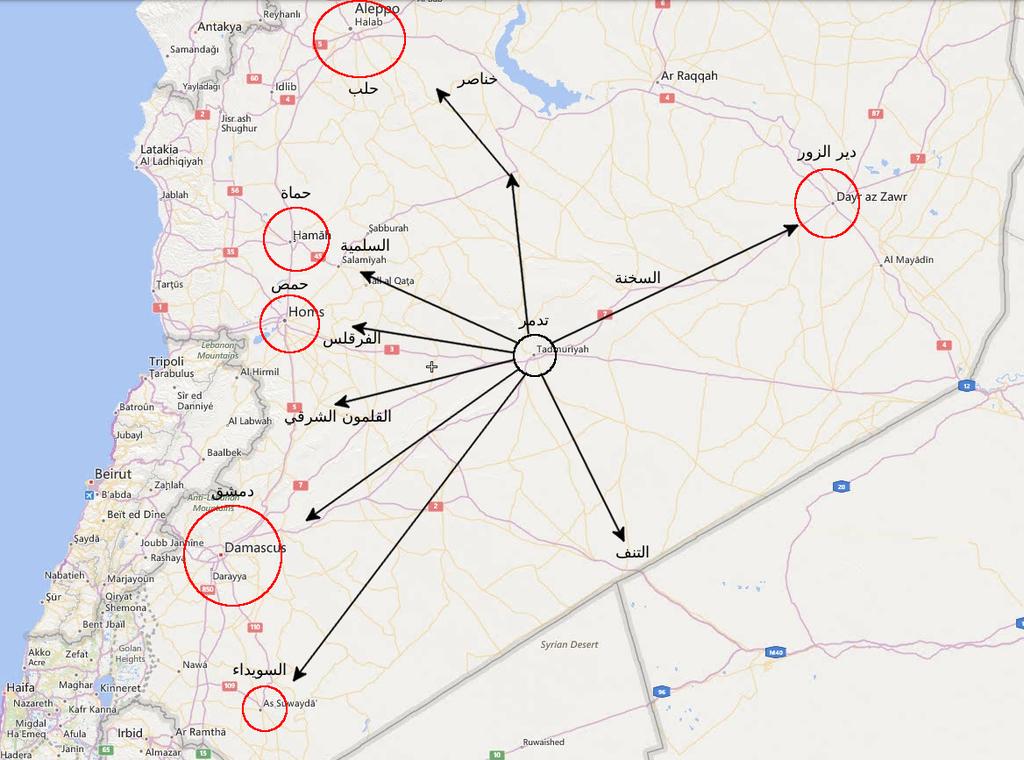 — Le sud-est d'Homs et la zone de Palmyre pour sécuriser les grands axes Sud-Nord et Est-Ouest, et tenter de désenclaver la ville de Deir-El-Zor;
