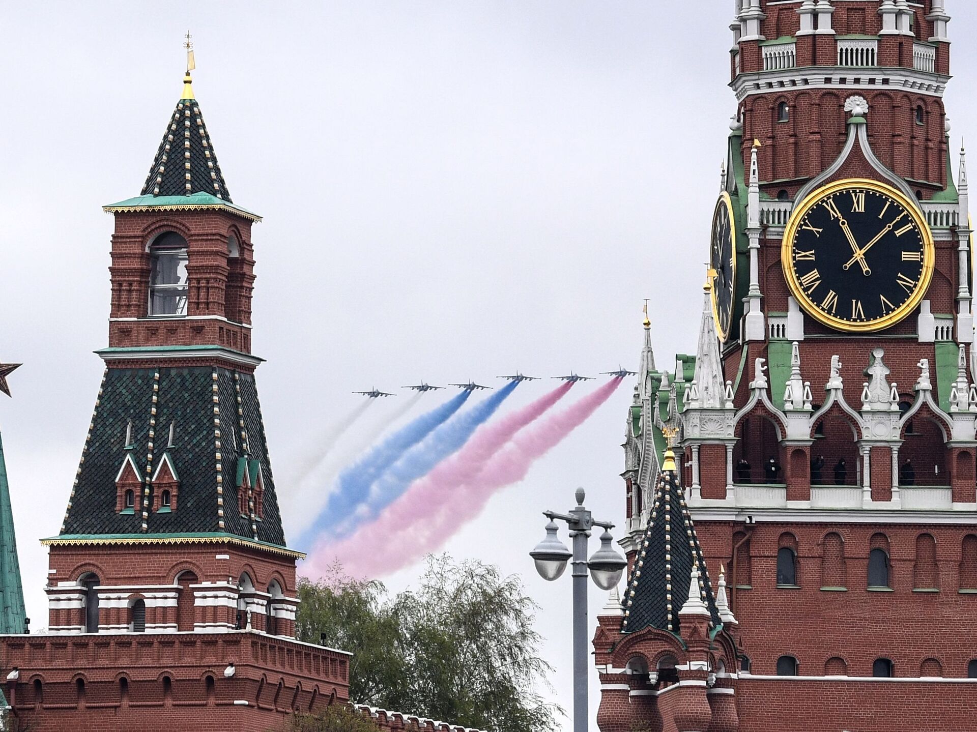 Enfin, six avions d’attaque Soukhoï Su-25 ont clos le défilé, laissant dans le ciel moscovite une traînée blanc-bleu-rouge aux couleurs du drapeau de la Russie.