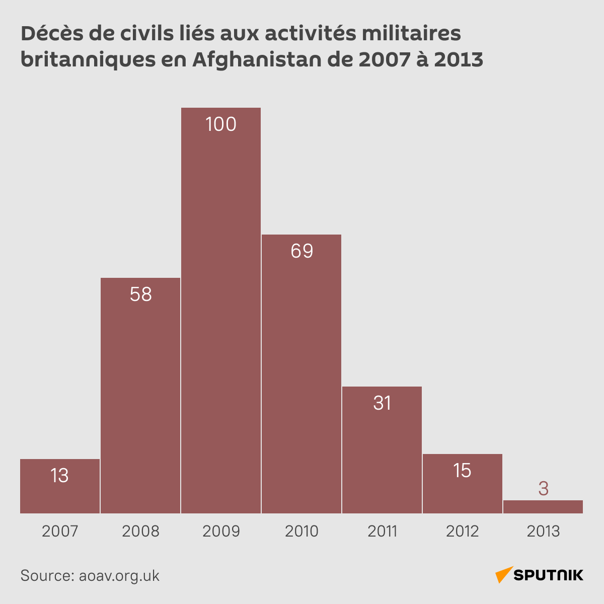 Contacté par Action on Armed Violence (AOAV), une organisation caritative non-gouvernementale établie à Londres, le ministère de la Défense du Royaume-Uni a déclassifié des dossiers relatifs aux accidents, souvent mortels, causés en Afghanistan par les forces armées britanniques. Et aux indemnisations payées par la suite.Après avoir minutieusement analysé ces documents "fortement incohérents", l’AOAV a publié un rapport détaillé sur ce sujet.Quant aux civils afghans, l’organisation met en avant que le département militaire a officiellement informé qu’il n’enregistrait pas et ne faisait pas d’estimations de l’ensemble des décès ou dommages liés aux activités militaires britanniques dans le monde, et en Afghanistan en particulier.L’AOAV constate également que l’estimation du nombre de victimes civiles est compliquée par le fait que certaines demandes d’indemnisation ont été rejetées après avoir été examinées au sein du ministère.Selon les dossiers divulgués, entre 2006-2013 les autorités du Royaume-Uni ont payé 529 compensations, dont 289 versements ont été effectués pour des accidents causés par les militaires britanniques et qui ont entraîné la mort de civils afghans.L’AOAV souligne également que ces 289 décès ne correspondent qu’au nombre de plaintes déposées par les familles concernées, tandis que beaucoup d’Afghans soit n’étaient pas au courant d’une telle option, soit avaient peur des talibans* et n’osaient pas s’adresser aux militaires étrangers.L’association suppose que les morts enregistrés dans ce type de documents ne représentent qu’une partie des décès causés par les soldats britanniques en Afghanistan.Un ancien officier du renseignement militaire en Irak et conseiller justice en Afghanistan, Frank Ledwidge, dans son livre sorti en 2013 Investment in Blood: The True Cost of Britain’s Afghan War, a estimé qu’en 2007 au moins 220 civils ont été tués ou blessés par les forces britanniques. Les dossiers dévoilés de la Défense n’en comptabilisent que 36 pour cette année-là.Une indemnisation minimum pour une vie?Le rapport détaille les montants que le Royaume-Uni a payés en tant que compensations.Au total, entre 2006 et 2014, les familles de 289 civils afghans tués par les militaires britanniques ont reçu 688.000 livres sterling (environ 805.000 euros).L’indemnisation moyenne se monte ainsi à 2.380 livres sterling, soit presque 2.790 euros.Les sommes versées dans chacun des cas se sont avérées d’ailleurs très variables et hétérogènes.L’indemnisation minimale payée par le Royaume-Uni en février 2008 pour le décès confirmé d’un civil afghan inconnu était de 104,7 livres sterling (125 euros).Quant au paiement le plus élevé, pour un tué à Kaboul en novembre 2007, a été compensé à hauteur de 54.347 livres sterling (63.624 euros).Sans trouver de logique dans ces calculs, l’AOAV n’exclut pas le rôle d’une couverture médiatique pour chaque épisode concret.Et d’ajouter que certaines des indemnisations pour une vie humaine étaient plus faibles que des versements pour des biens ou des animaux domestiques.Ainsi, en 2008, la Défense britannique a payé 662 livres sterling, soit 775 euros, pour six ânes tués mais compensé la perte d’un smartphone 110 livres sterling (presque 130 euros).Dans son courrier en date de 19 décembre 2014, le ministère s’explique:Femmes et enfantsL’analyse des dossiers a révélé trois causes principales de décès et de dommages aux civils afghans. Il s’agit tout d’abord de coups de feu tirés par les militaires britanniques (51%), ainsi que de frappes aériennes (25%) et de tirs terrestres, notamment des grenades et des mortiers (22%).Parmi les victimes dont les demandes d’indemnisation ont été approuvées par la Défense britannique, 71 ont été enregistrées comme concernant des femmes (43 tuées et 28 blessées) et au moins 28 mentionnaient des enfants (16 tués et 12 blessés).Il peut cependant s’agir de 138 mineurs (86 tués et 52 blessés), parce que dans leurs dossiers ces personnes ont été indiquées comme "fils", "fille", "neveu" ou "nièce", c’est-à-dire elles auraient pu avoir moins de 18 ans, précise le rapport de l’AOAV.Des pertes civiles difficilement évitables, selon la Défense britannique:* Organisation terroriste interdite en Russie