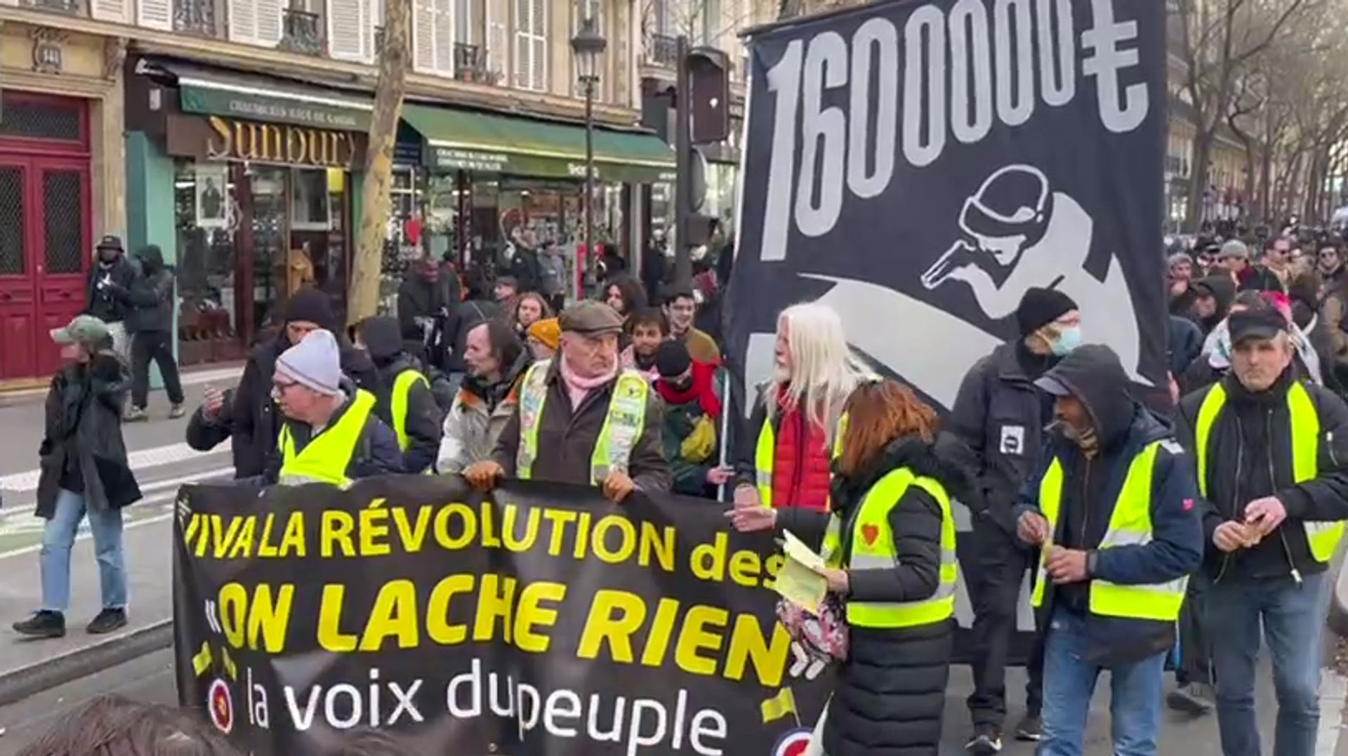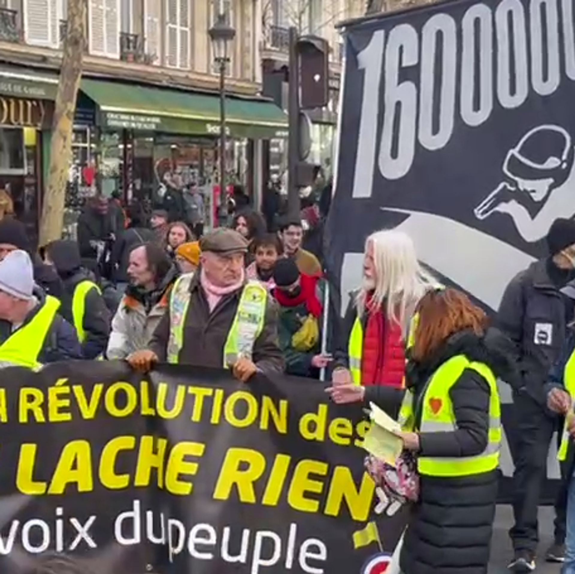 Sur les pancartes, on peut lire: "La révolution des Gilets jaunes ne lâche rien", "Stop aux violences et crimes d'État", "Ils nous divisent pour mieux régner, unissons-nous pour les virer".