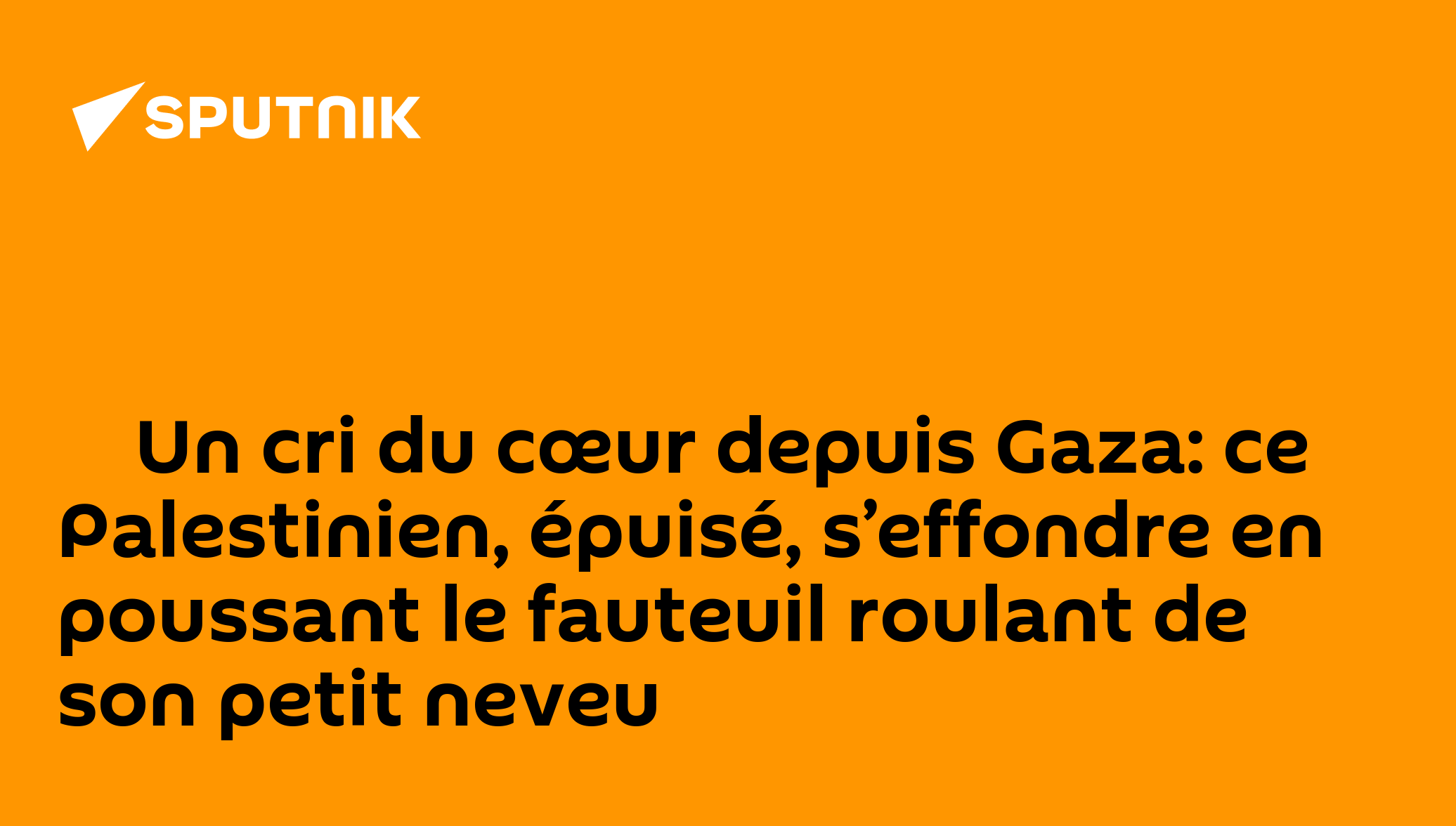 ▶ Un cri du cœur depuis Gaza: ce Palestinien, épuisé, s’effondre en poussant le fauteuil roulant de son petit neveuL'enfant est orphelin après la mort de son père dans un raid israélien. La vidéo de la famille (du moins ce qu'il en reste) avançant sur les routes dévastées de l'enclave circule sur les réseaux sociaux.Abonnez-vous @sputnik_afrique Sputnik Afrique | X