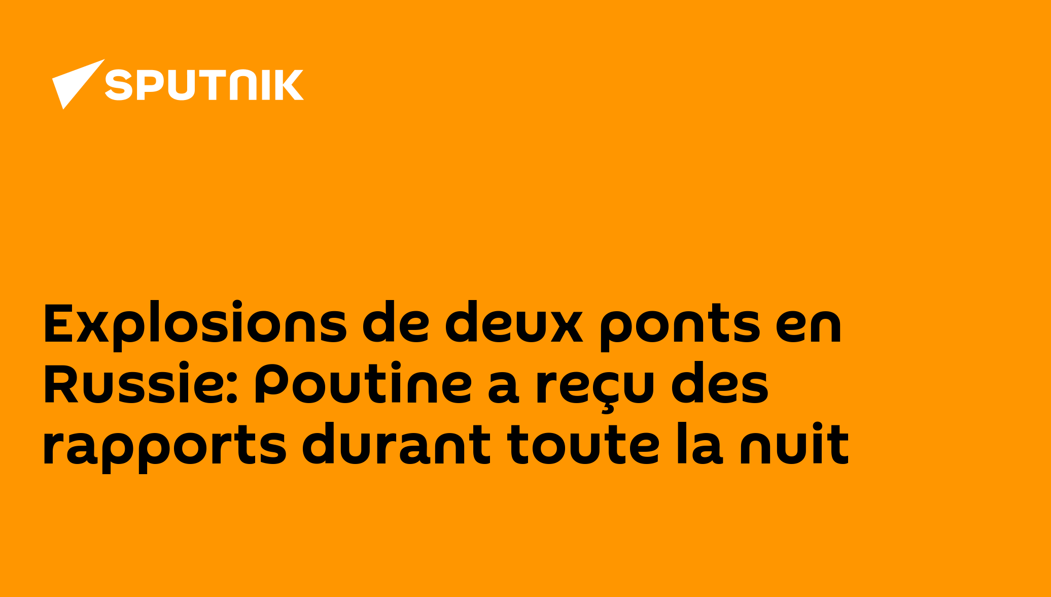 Explosions de deux ponts en Russie: Poutine a reçu des rapports durant toute la nuitLe Service fédérale de sécurité et le ministère des Situations d'urgence lui ont fourni toutes les informations, a déclaré le porte-parole de la présidence russe.Abonnez-vous @sputnik_afrique Sputnik Afrique | X