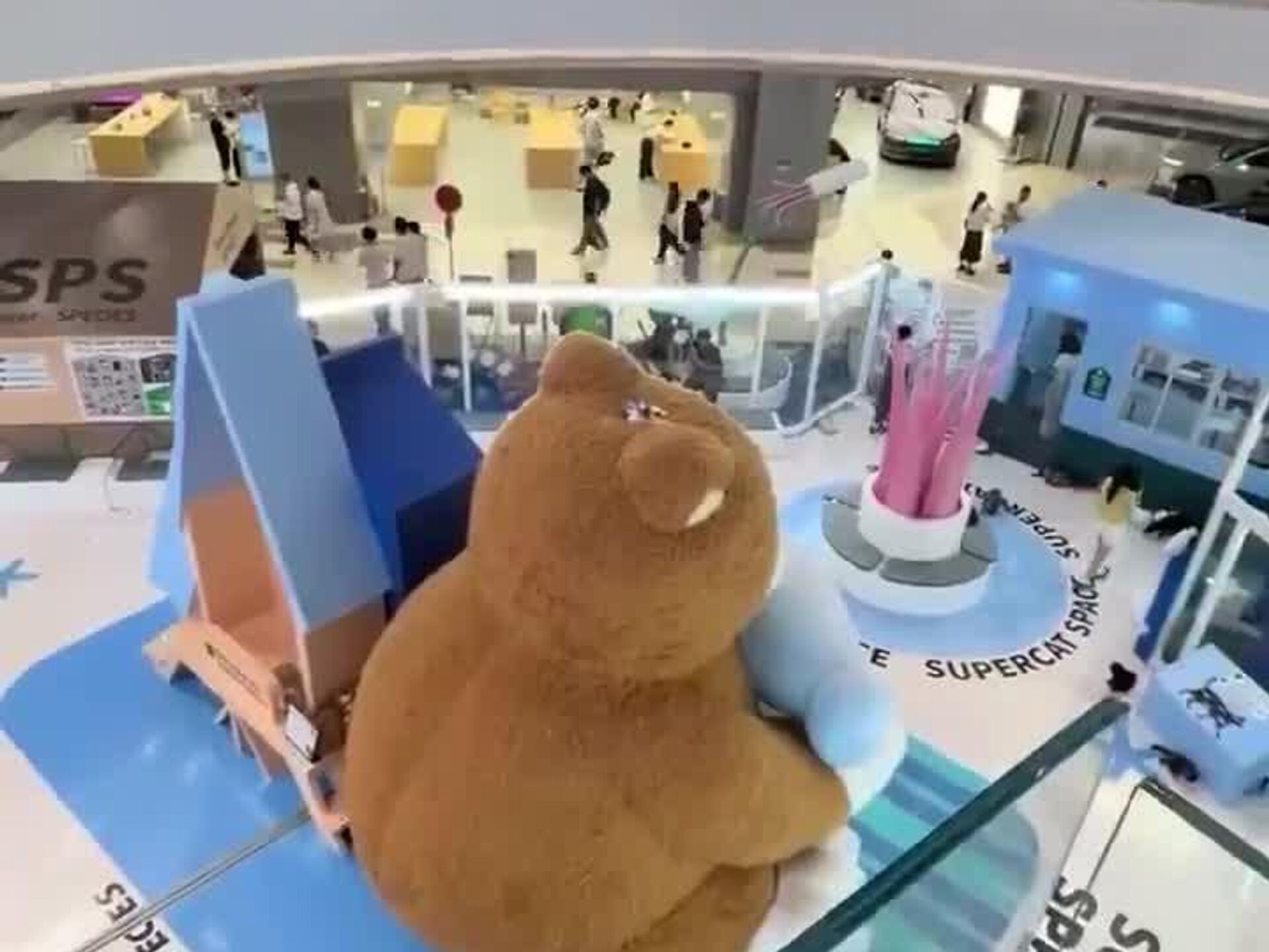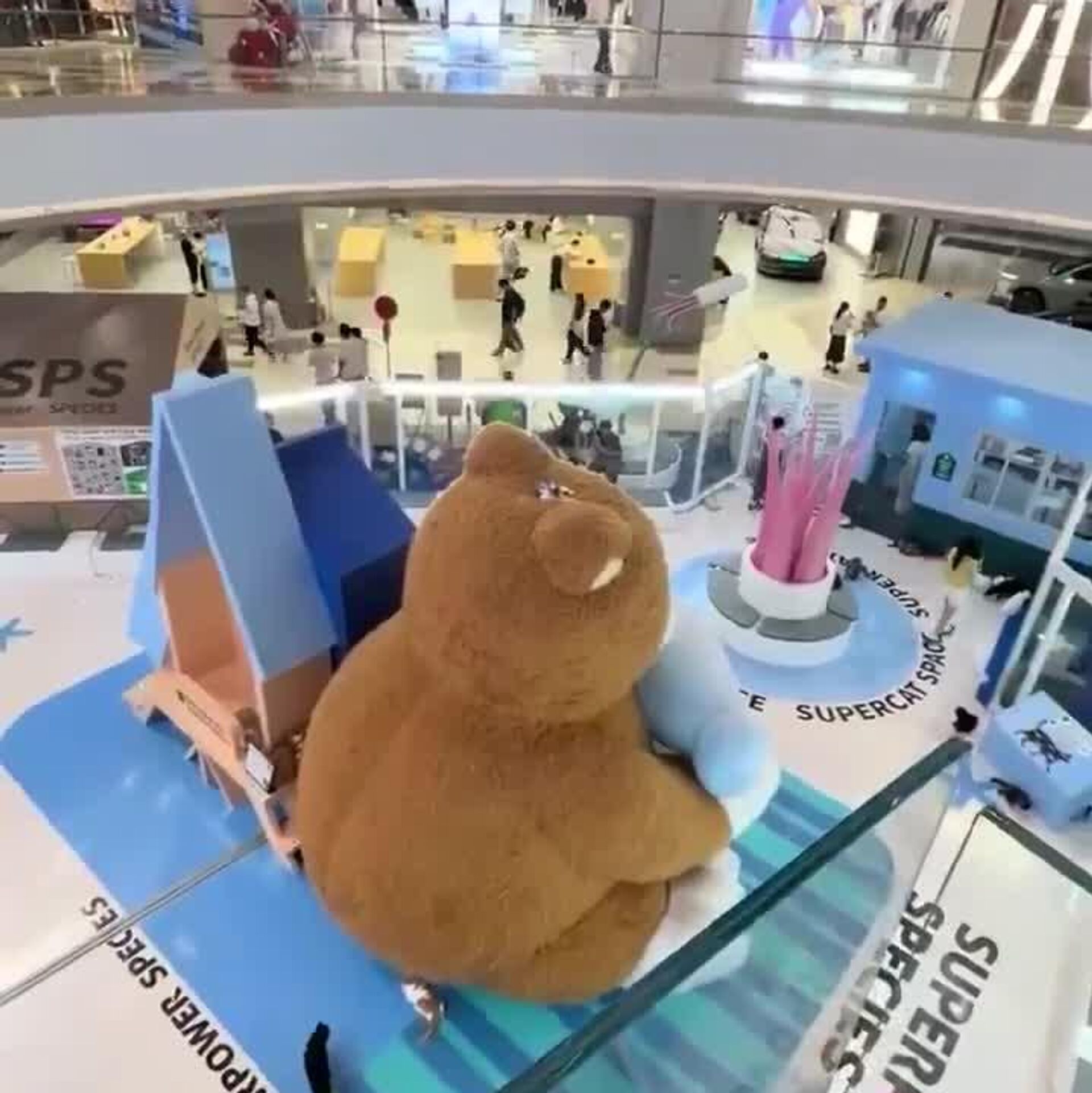 Dans un centre commercial, un chat, probablement en quête de gloire, a escaladé un ours en peluche plus grand qu’un bouddha pour y faire… une sieste de compétition!