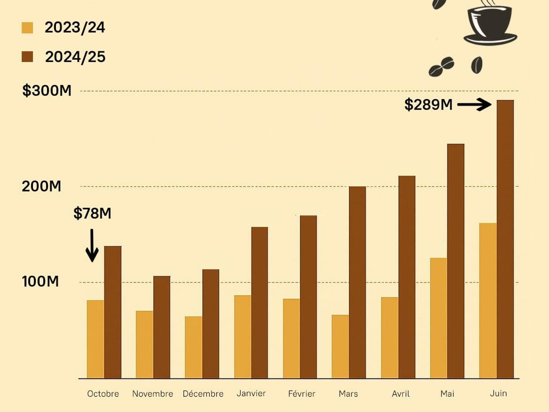🟠 des problèmes de production liés à la sécheresse au Brésil et au Vietnam, qui ont entraîné une hausse record des prix mondiaux du café.