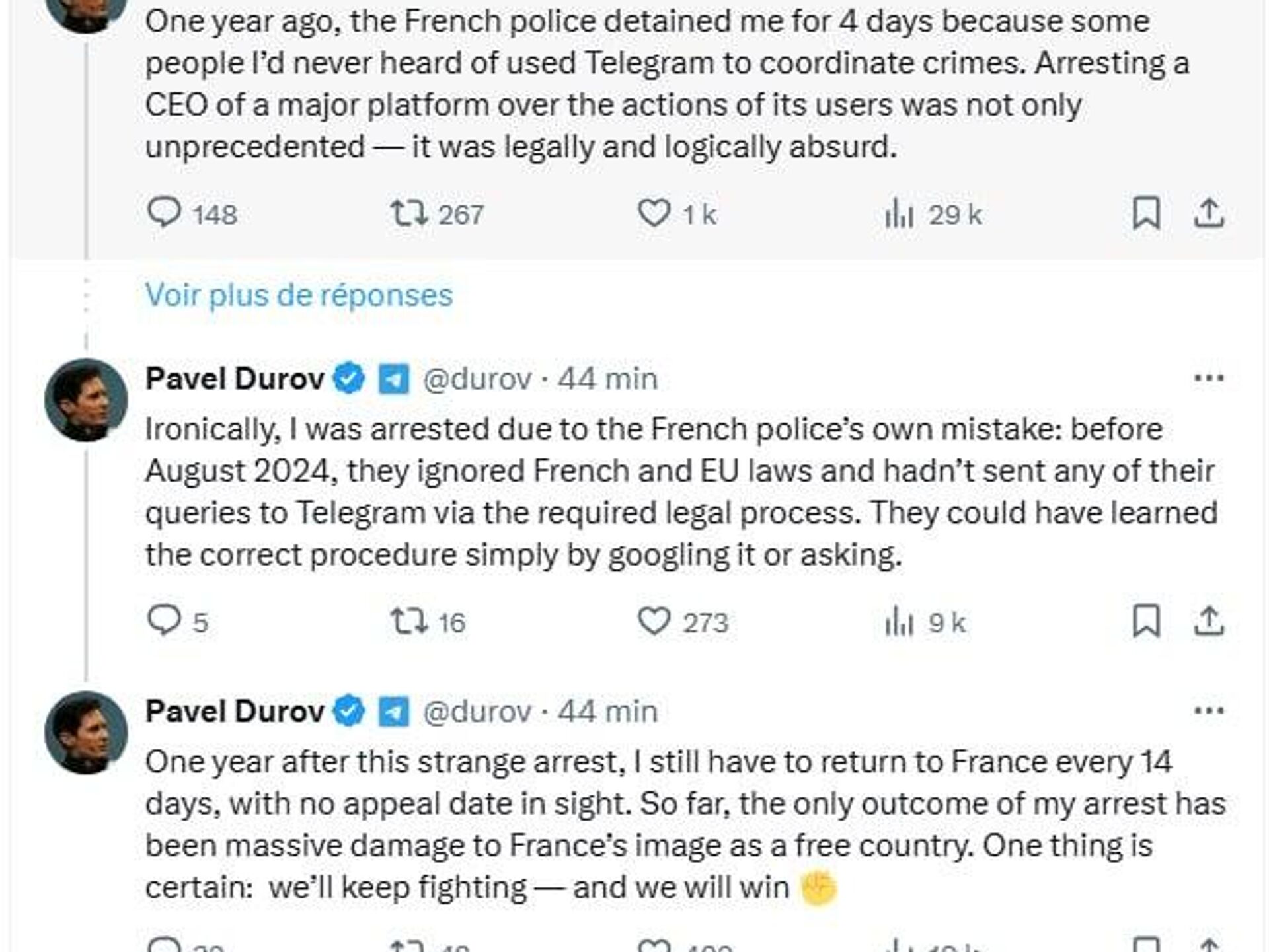"Avant août 2024, la police ignorait les lois françaises et européennes. Elle n’avait envoyé aucune de ses requêtes à Telegram via la procédure légale requise. Ils auraient pu apprendre la bonne procédure simplement en la cherchant sur Google ou en demandant", indique le fondateur de Telegram.