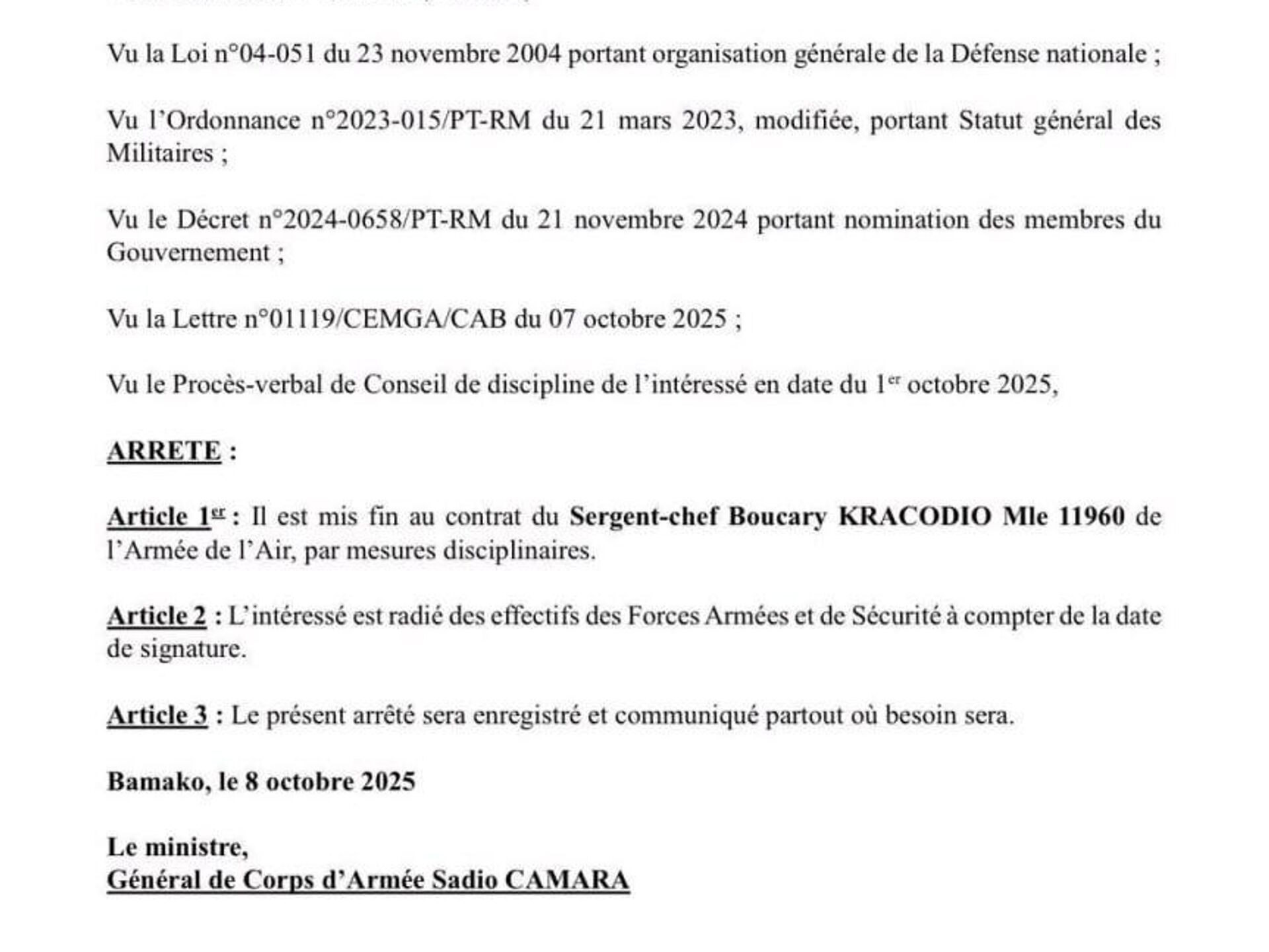 Les décisions de radiation, signées par le Président Assimi Goïta et le ministre de la Défense Sadio Camara, concernent des officiers de différentes unités, dont: