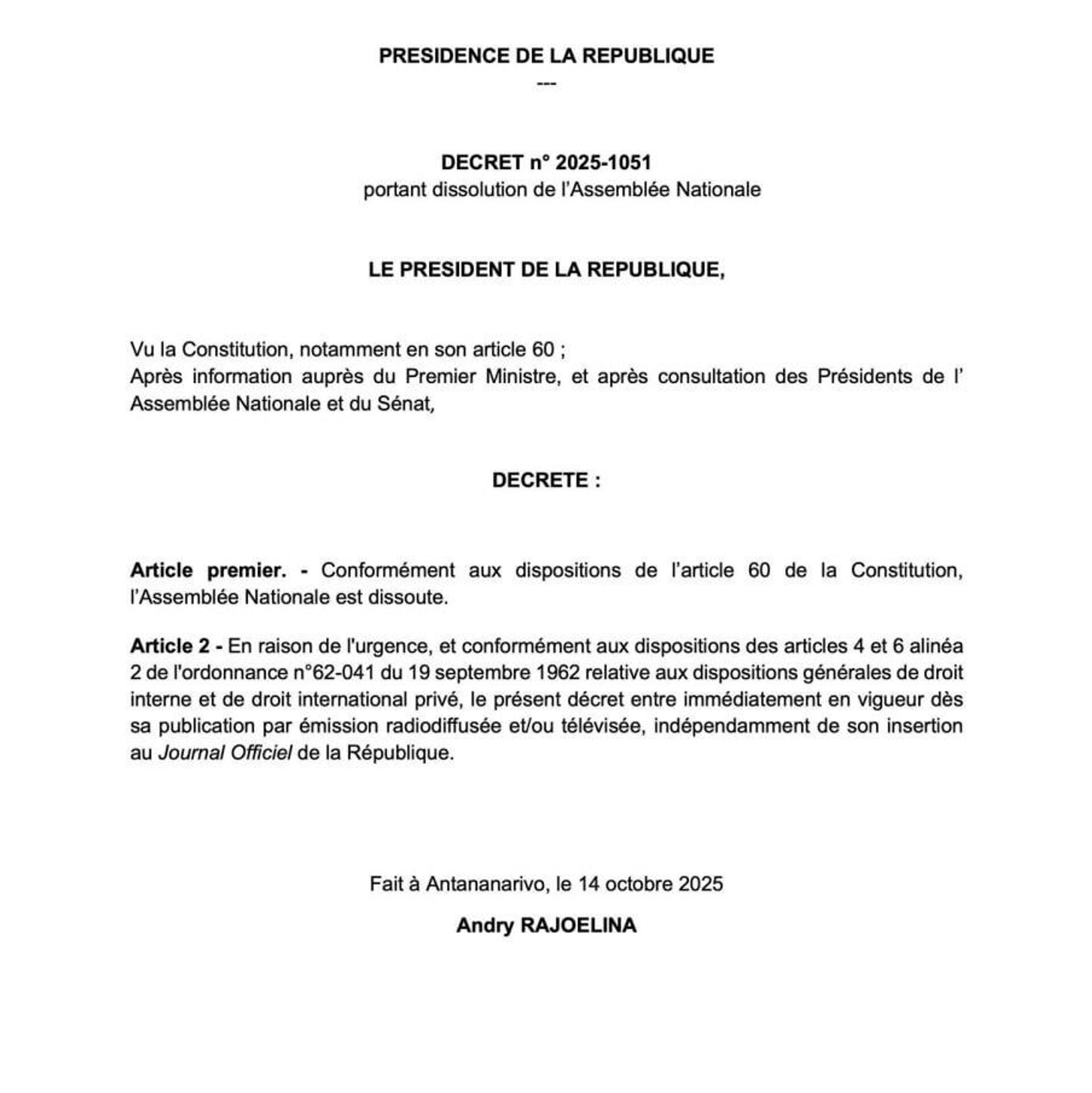 Le Président malgache annonce la dissolution de l'Assemblée nationale en raison des troubles