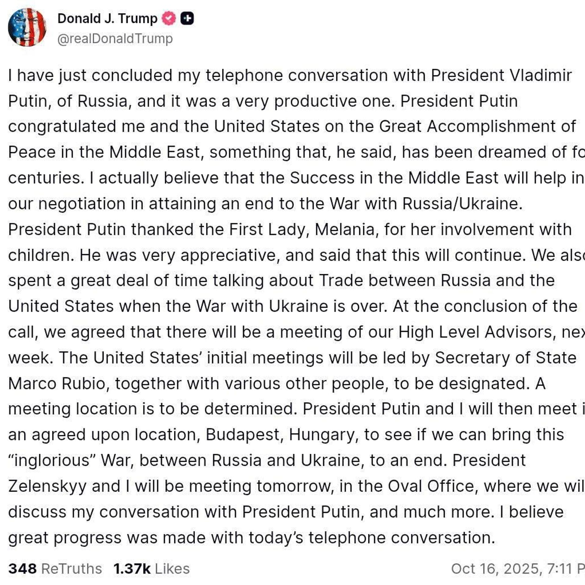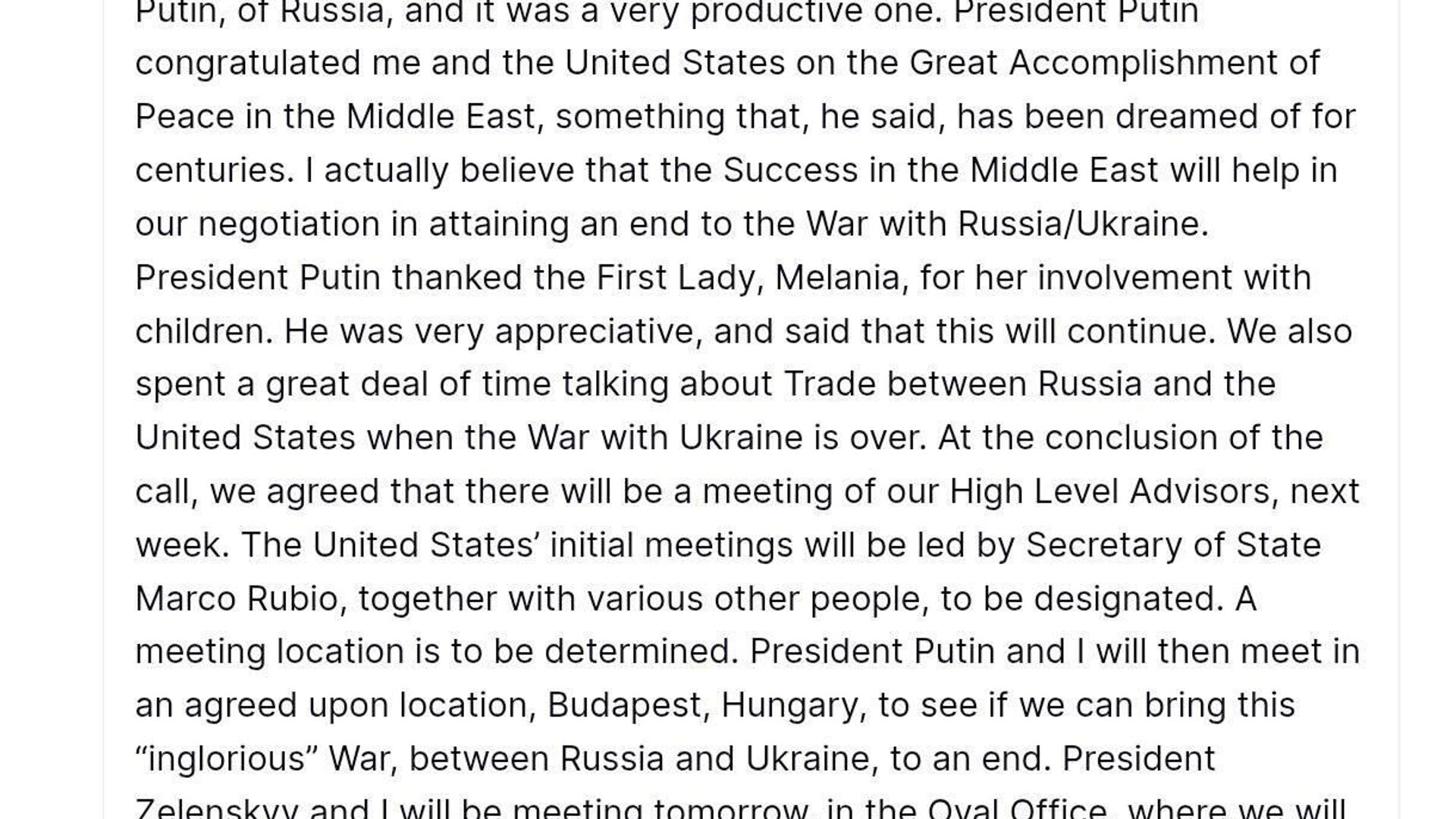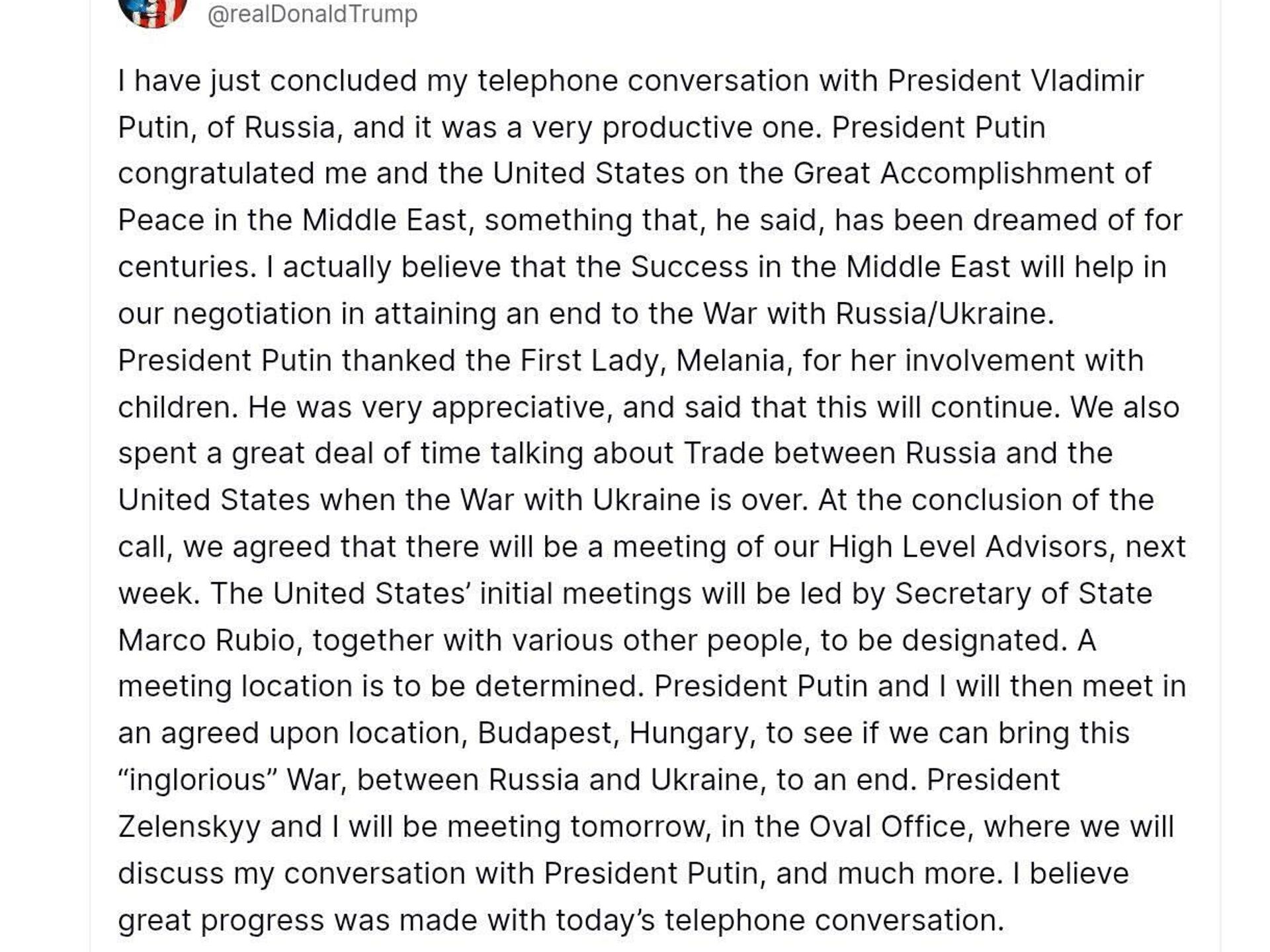 "Nous allons voir si nous sommes en mesure de mettre fin à cette guerre 'honteuse' entre la Russie et l'Ukraine", a écrit le Président US sur sa page Truth Social.