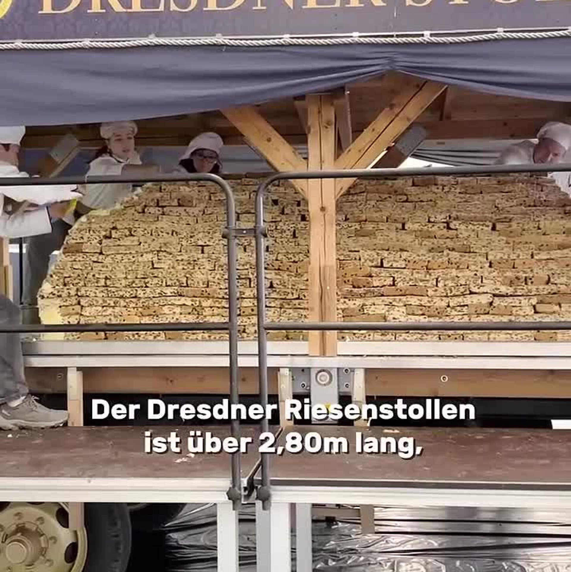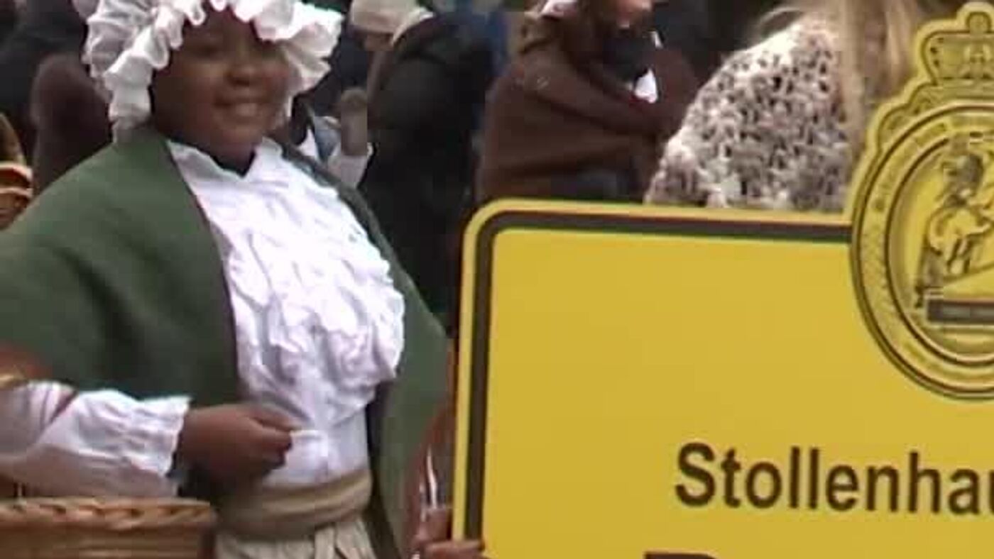 Plus de 500 boulangers en tenue d’époque ont marché ce 6 décembre dans le centre-ville. Derrière eux, un tracteur qui tire fièrement le vrai héros de la journée: un Stollen géant de 2,8 mètres de long, 1,4 mètre de large et plus de 2 tonnes de beurre, fruits confits et sucre glace.