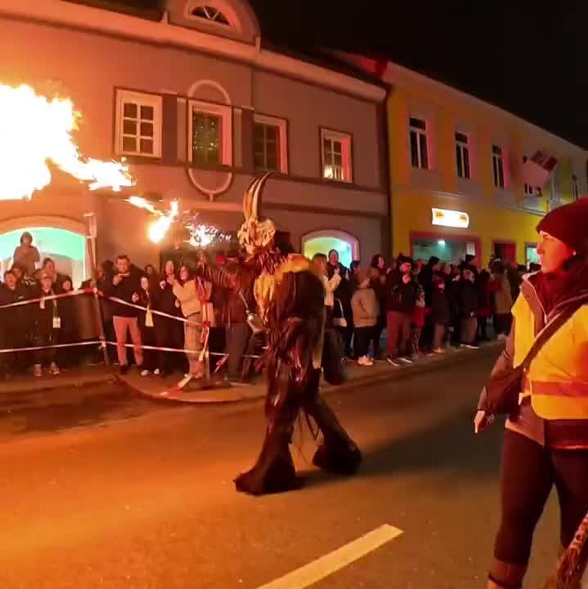 Lors d’une parade hivernale, l’un des Krampus — ces créatures démoniaques censées punir les enfants désobéissants — a vu son masque prendre feu.