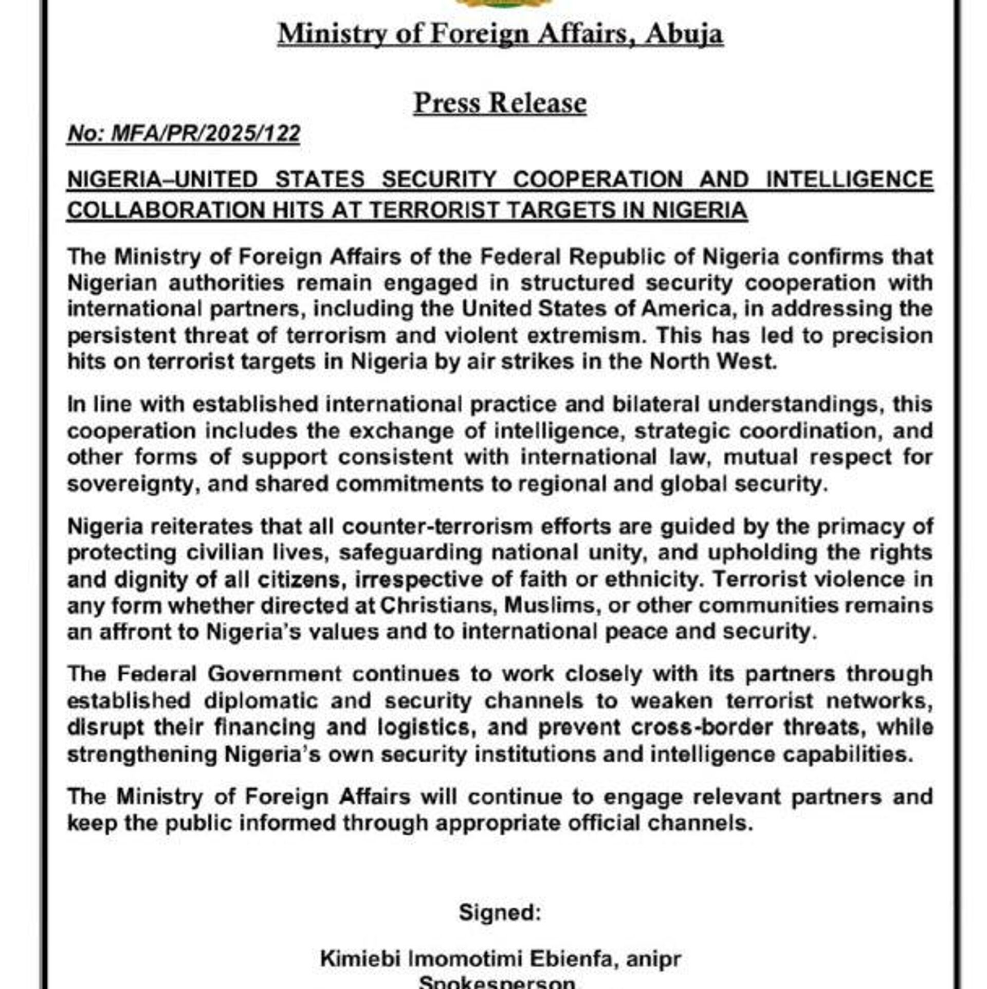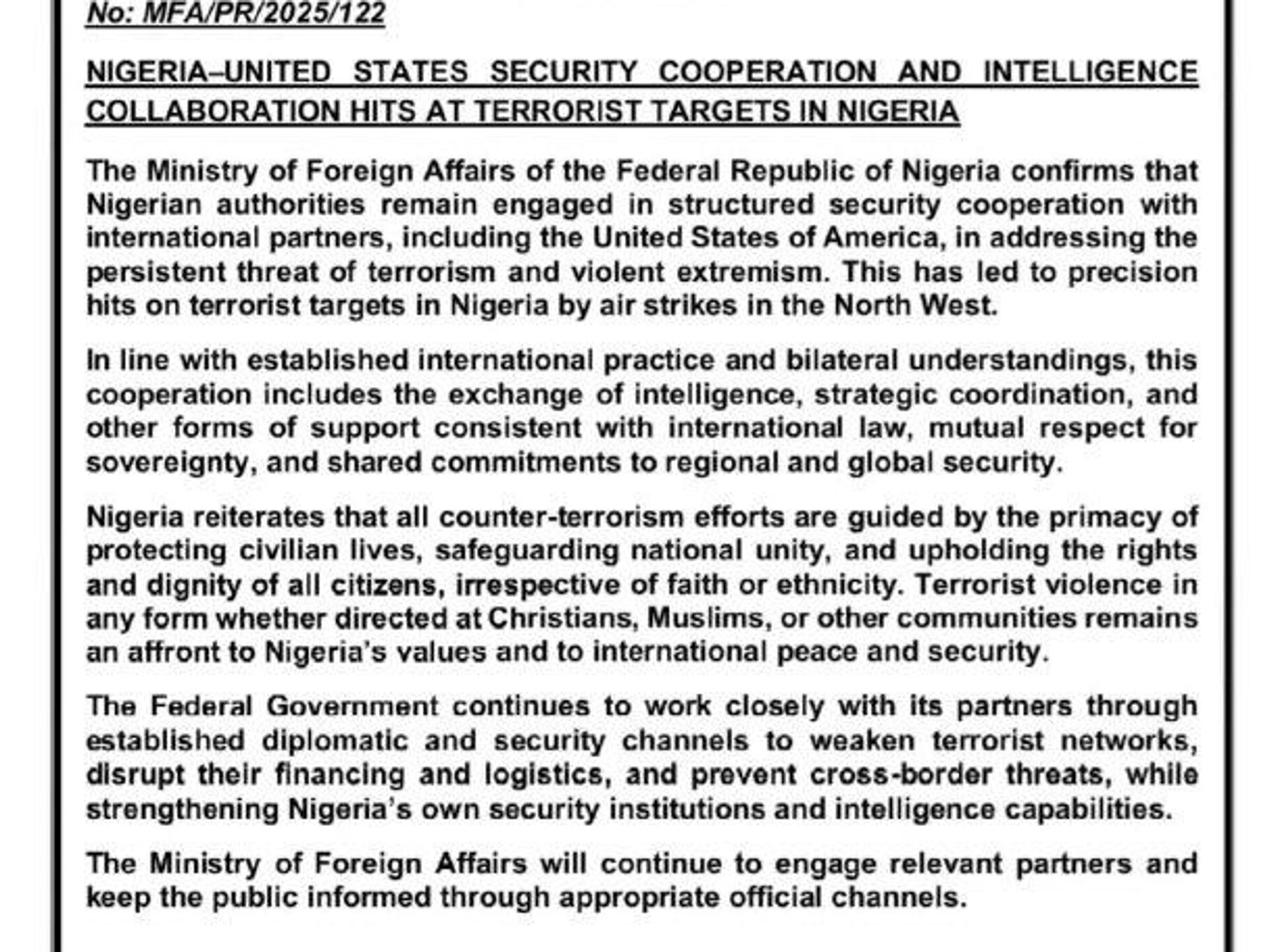 Les autorités du pays "continuent de s’engager dans une coopération structurée en matière de sécurité avec leurs partenaires internationaux, notamment les États-Unis", a écrit le ministère nigérian des Affaires étrangères dans un communiqué du 26 décembre.