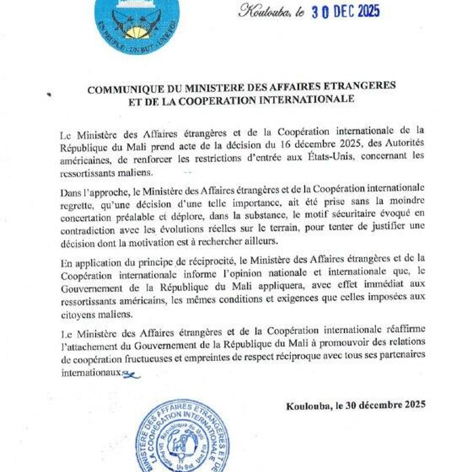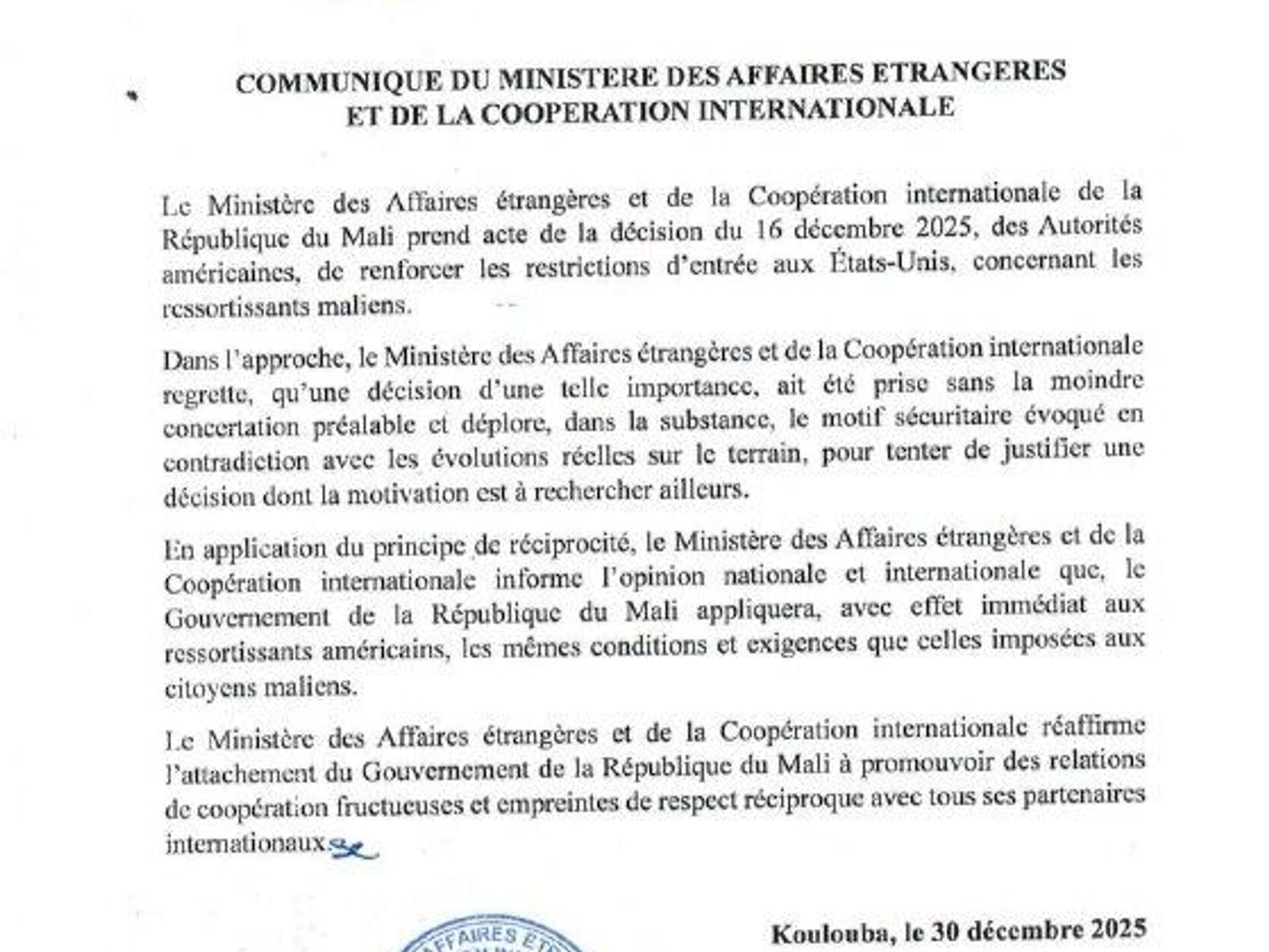 "En application du principe de réciprocité, le ministère des Affaires étrangères informe l'opinion nationale et internationale que le gouvernement du Mali appliquera, avec effet immédiat, aux ressortissants américains, les mêmes conditions et exigences que celles imposées aux citoyens maliens", indique un communiqué.