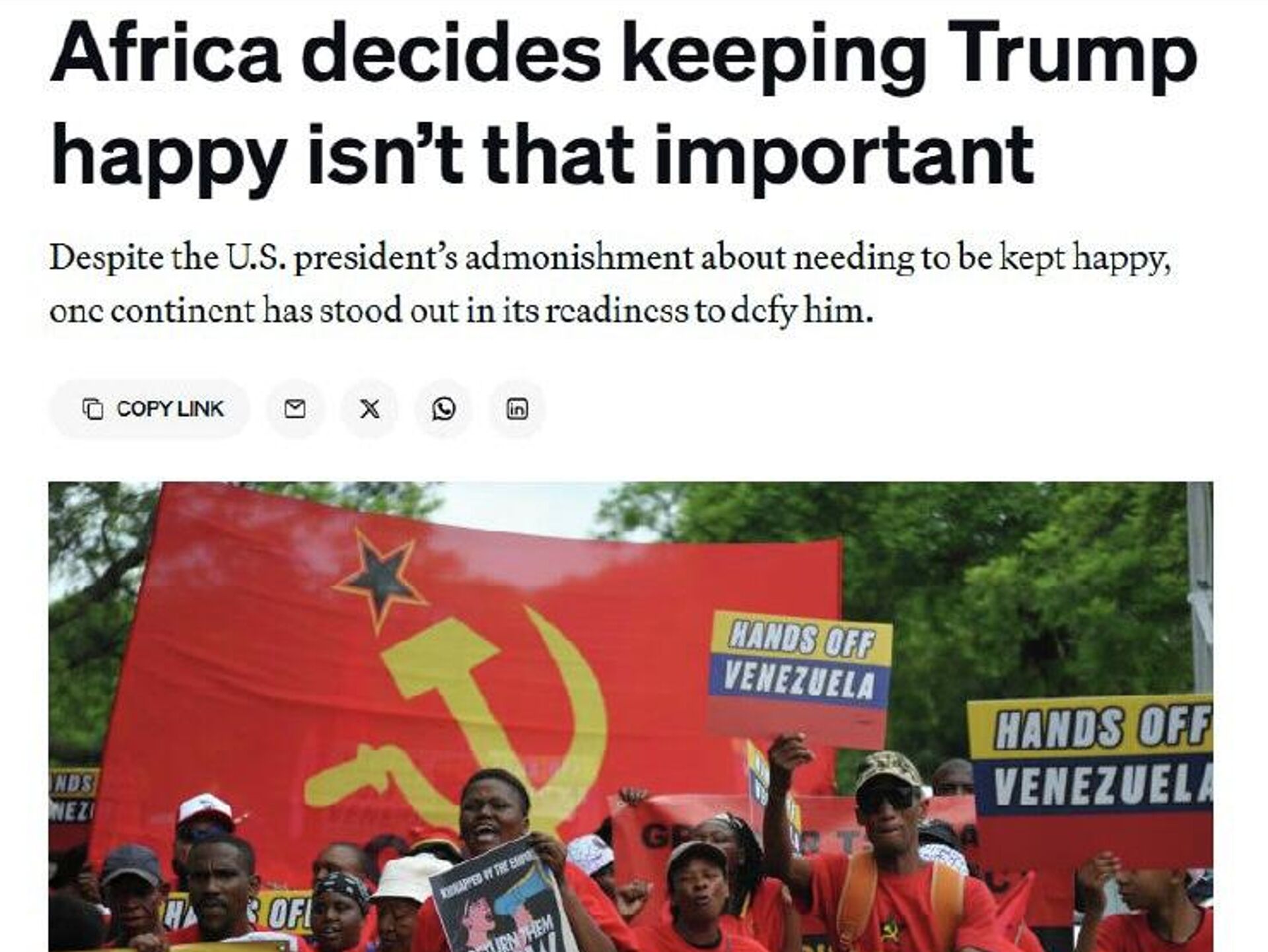 "La franchise et l'unité de l'Afrique à l'égard de l'enlèvement de Maduro contrastent fortement avec la réaction plus désordonnée de l'Amérique latine, ainsi qu'avec les réactions largement évasives de l'Europe", indique le journal.