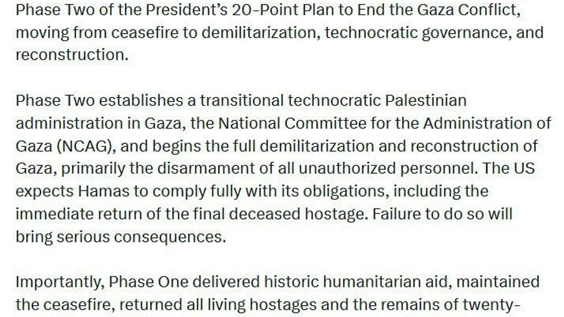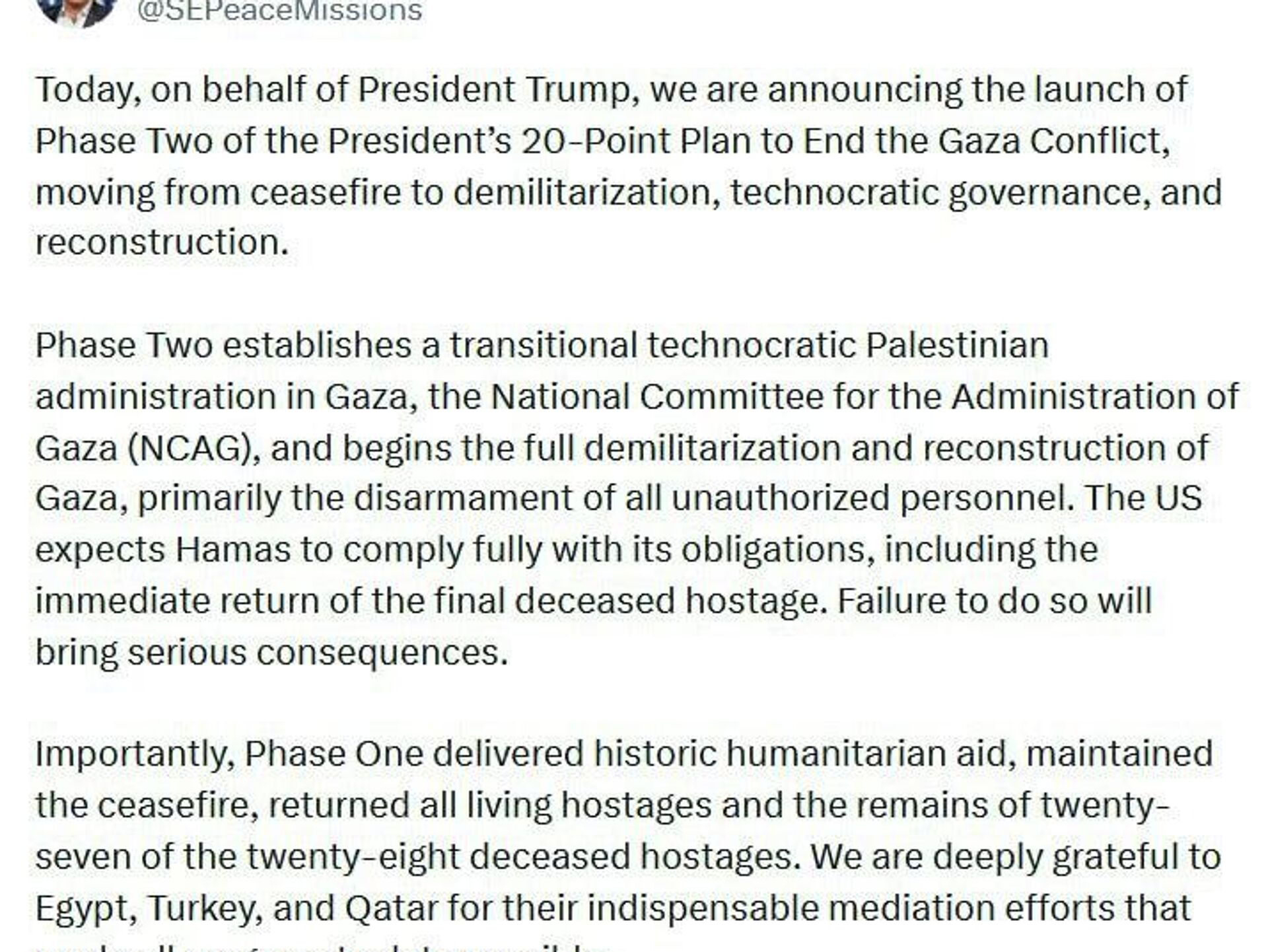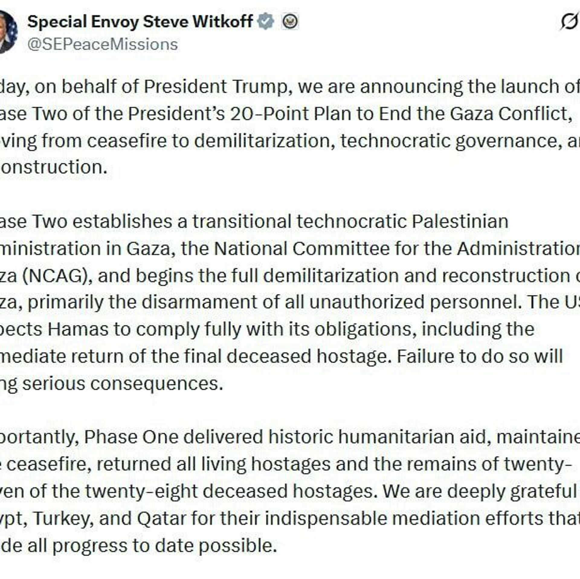 "La deuxième phase établit une administration palestinienne de transition et technocratique à Gaza et entame la démilitarisation complète et la reconstruction de Gaza", a indique l'envoyé spécial américain.