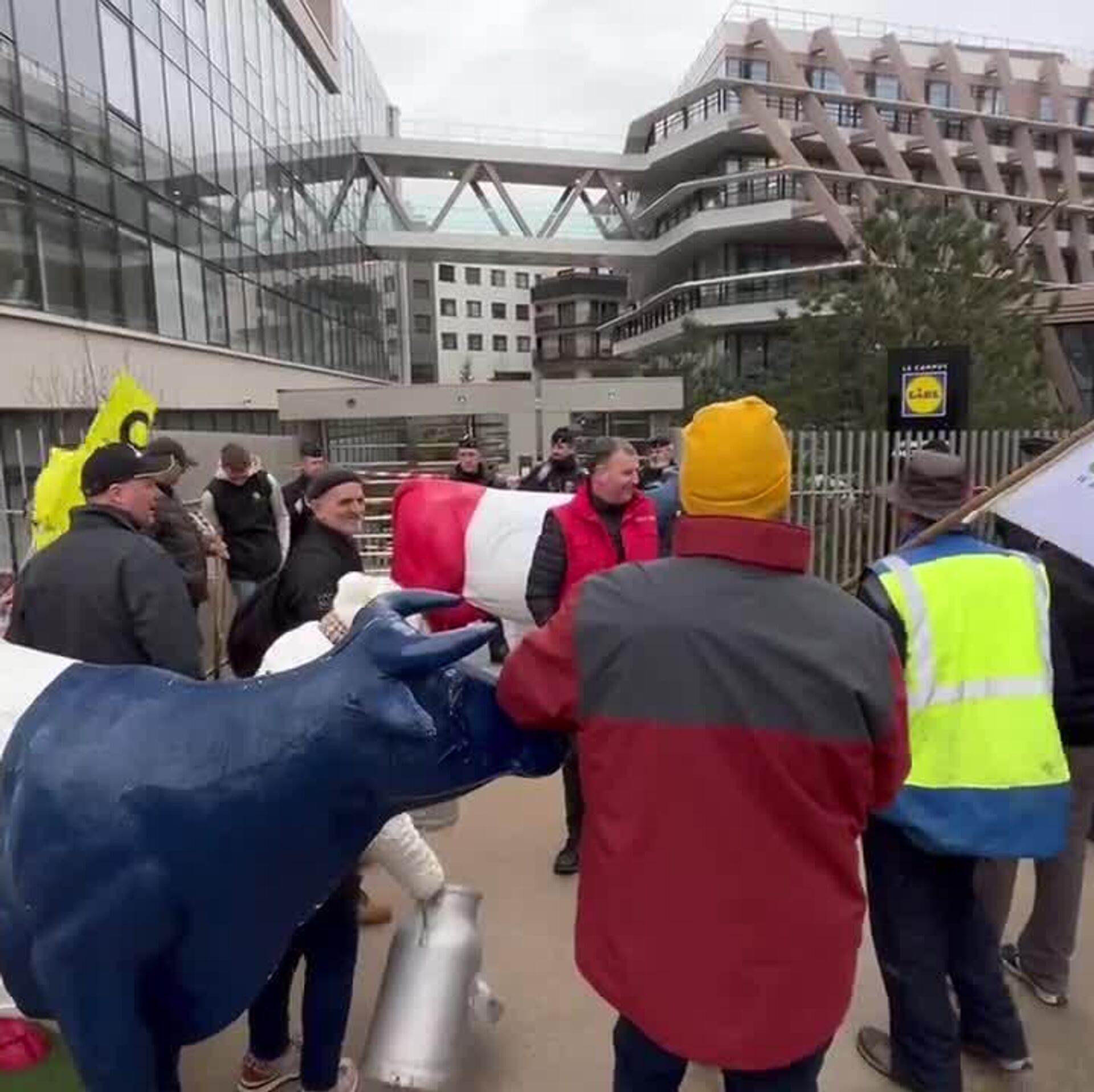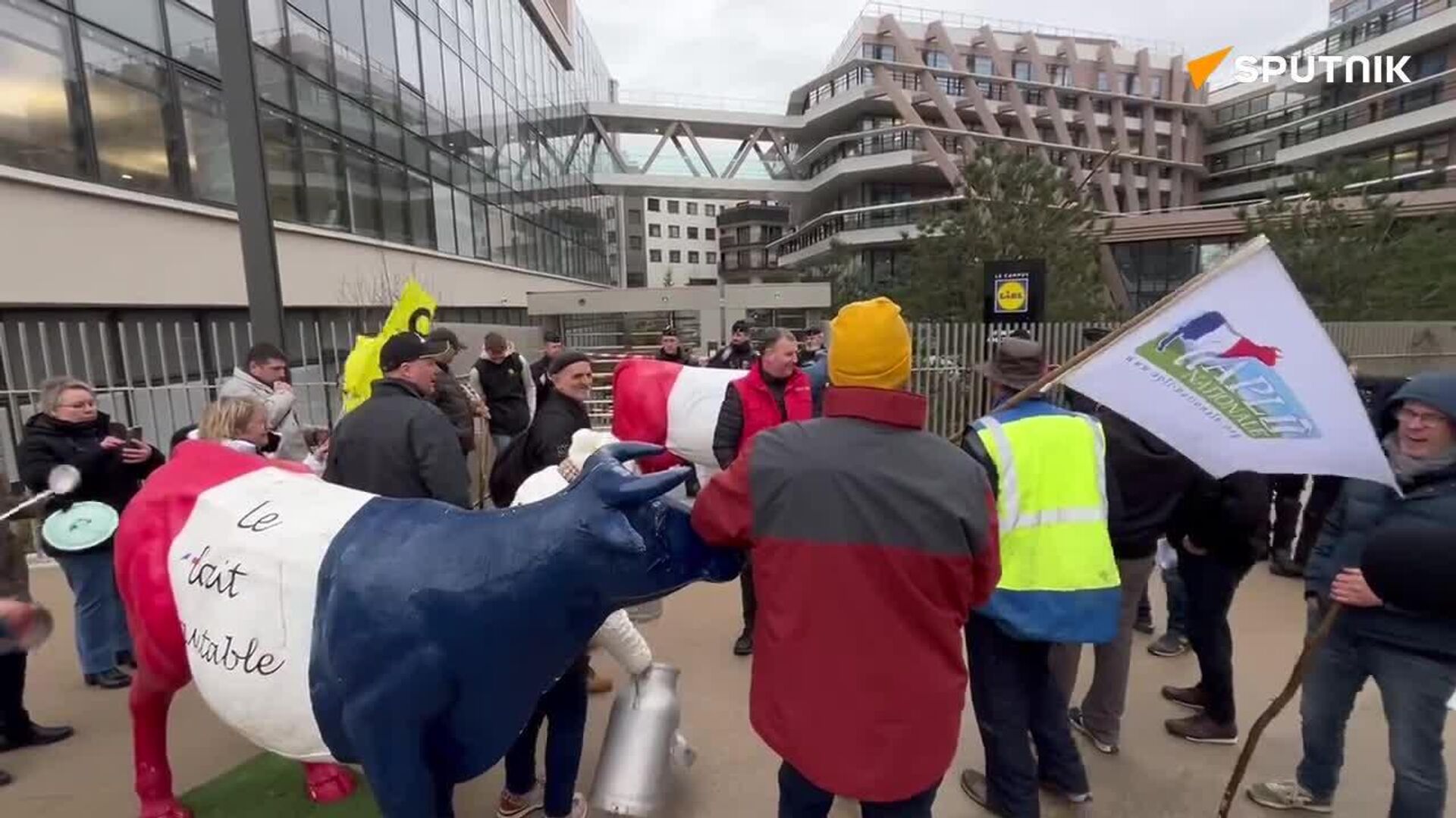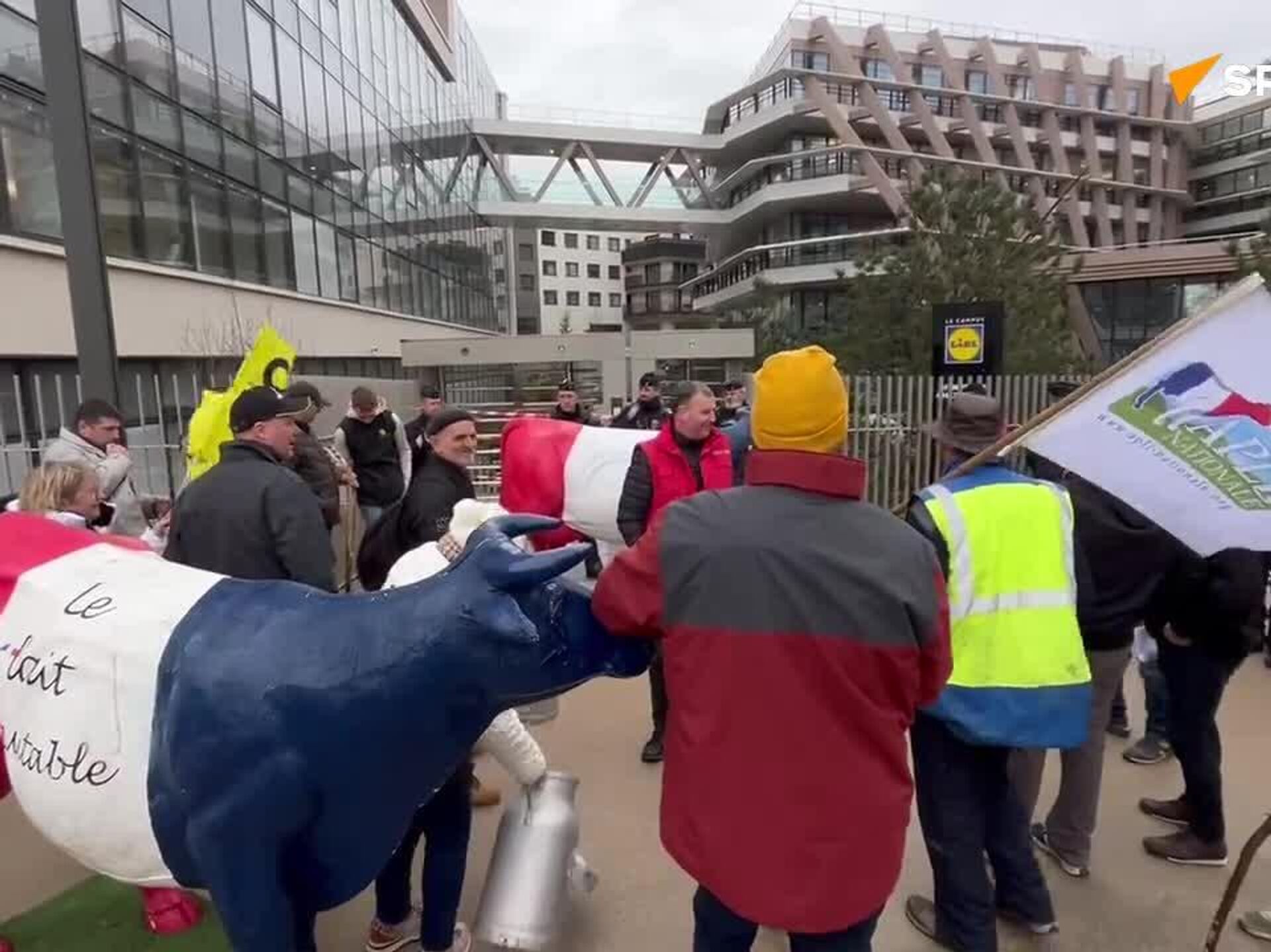 Des éleveurs laitiers de l’Association des producteurs de lait indépendants (Apli) ont occupé le siège du distributeur Lidl ce jeudi matin au sud de Paris, avant de procéder à une distribution de lait “Équitable, faire France” place d’Italie.