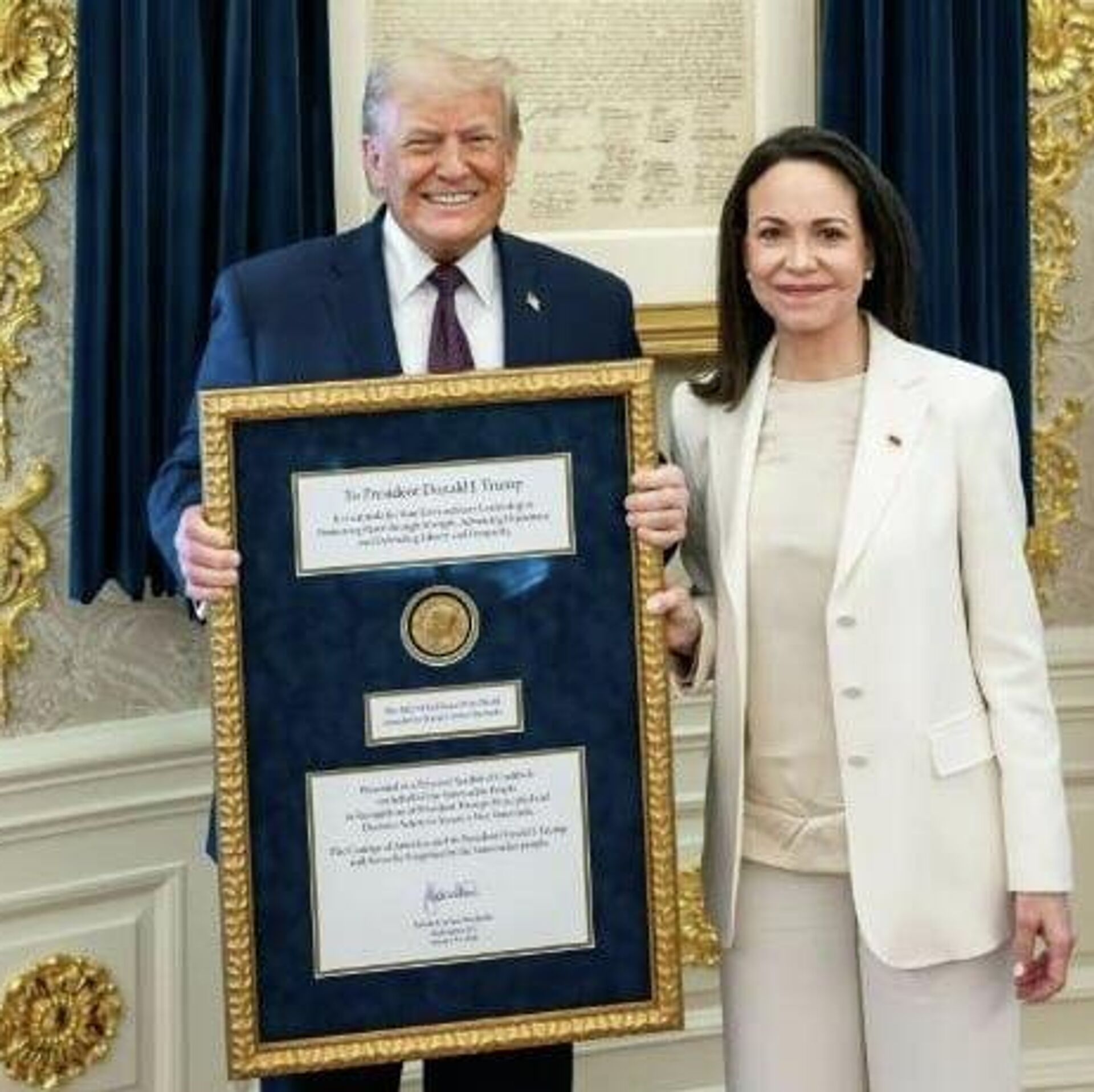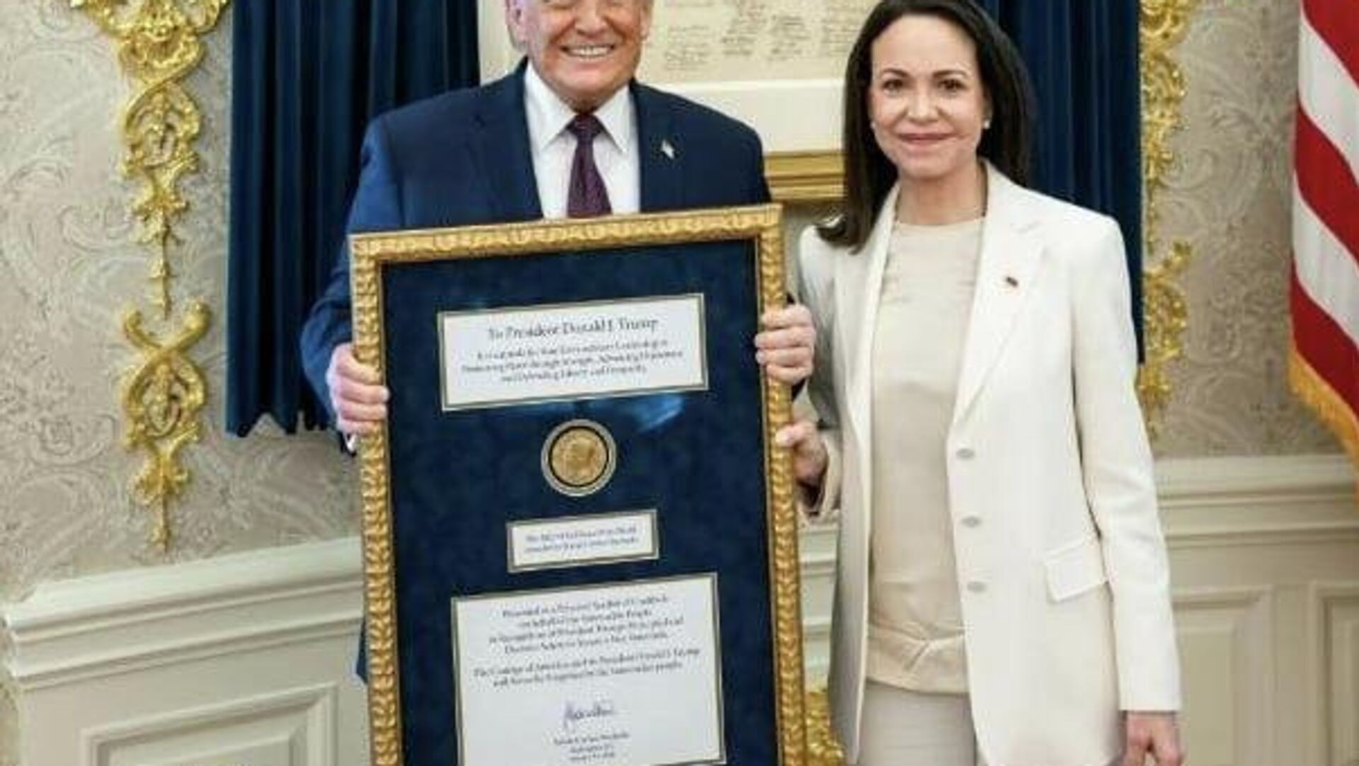 "Maria m'a remis son prix Nobel de la paix pour le travail que j'ai accompli. Quel magnifique geste de respect mutuel. Merci Maria!", a écrit le chef de l’exécutif américain.