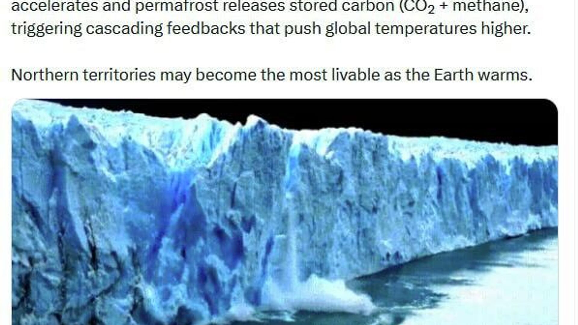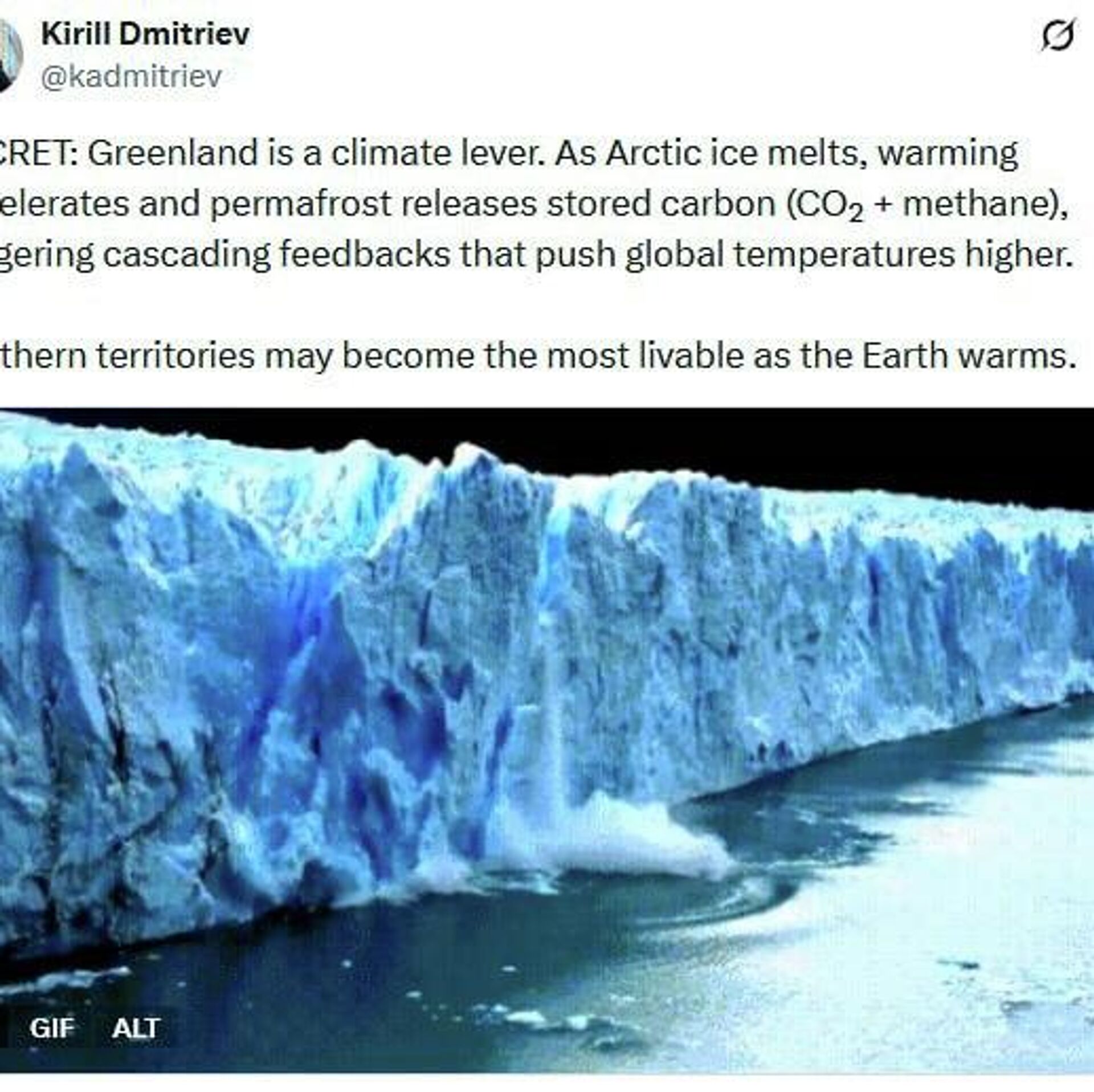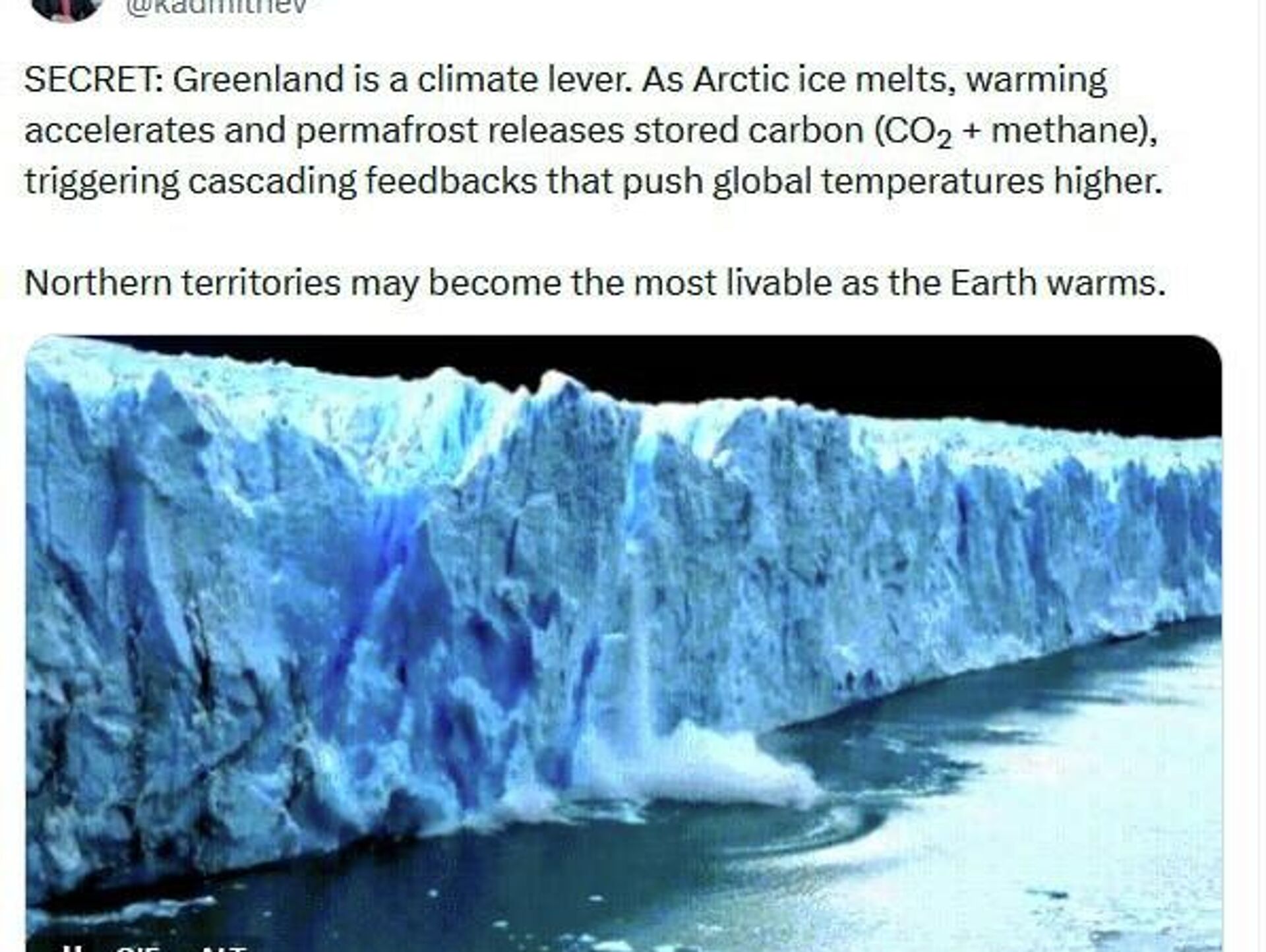 "La fonte des glaces arctiques accélère le réchauffement et libère le carbone stocké dans le pergélisol (CO₂ + méthane), déclenchant des réactions en chaîne qui contribuent à l’augmentation des températures mondiales. Les territoires nordiques pourraient devenir les plus vivables à mesure que la Terre se réchauffe", a-t-il expliqué.