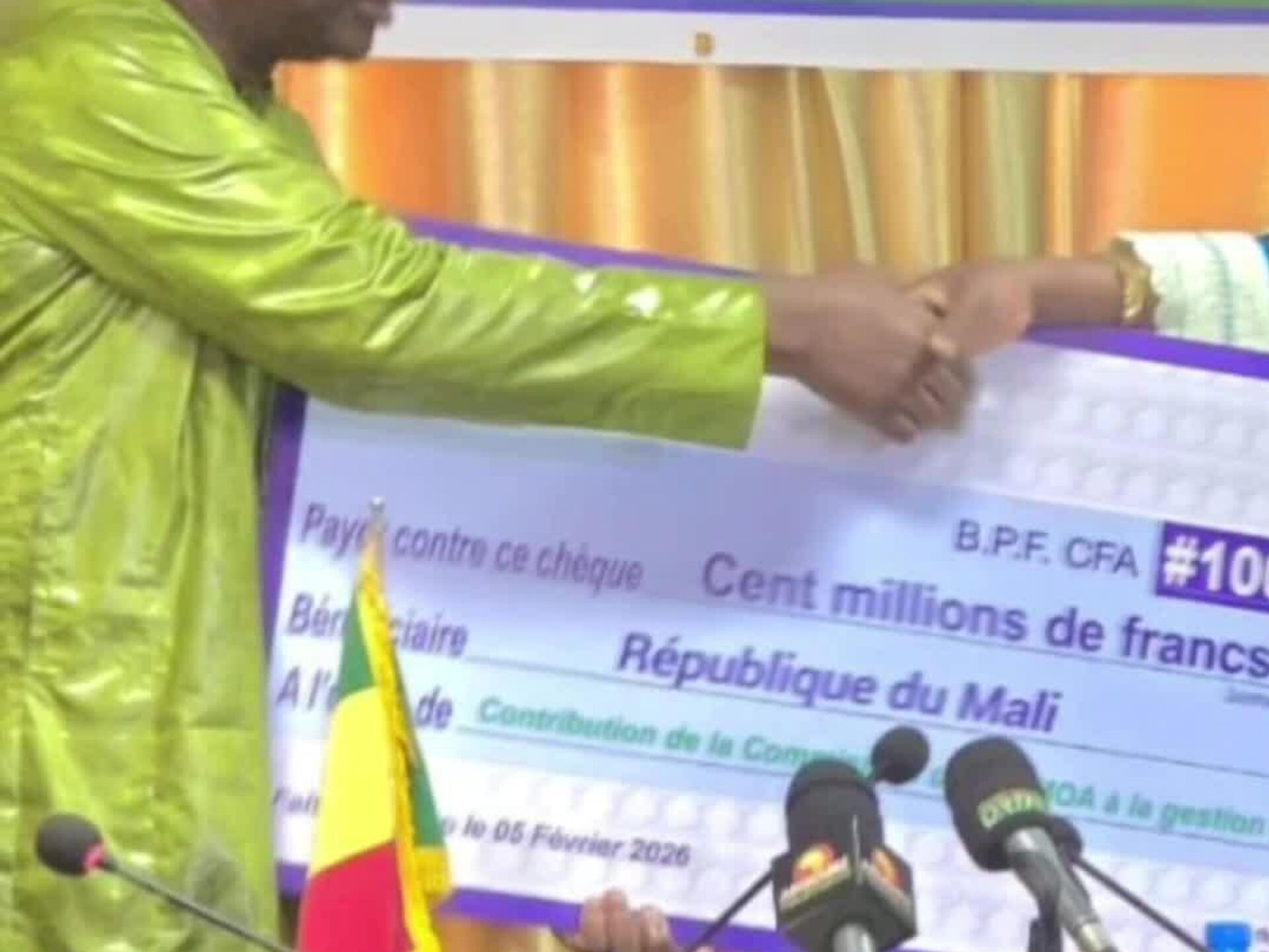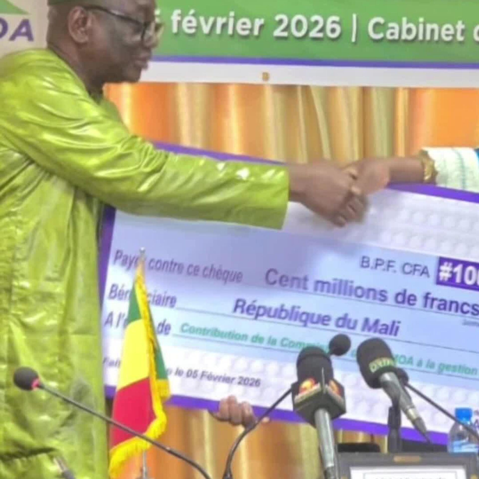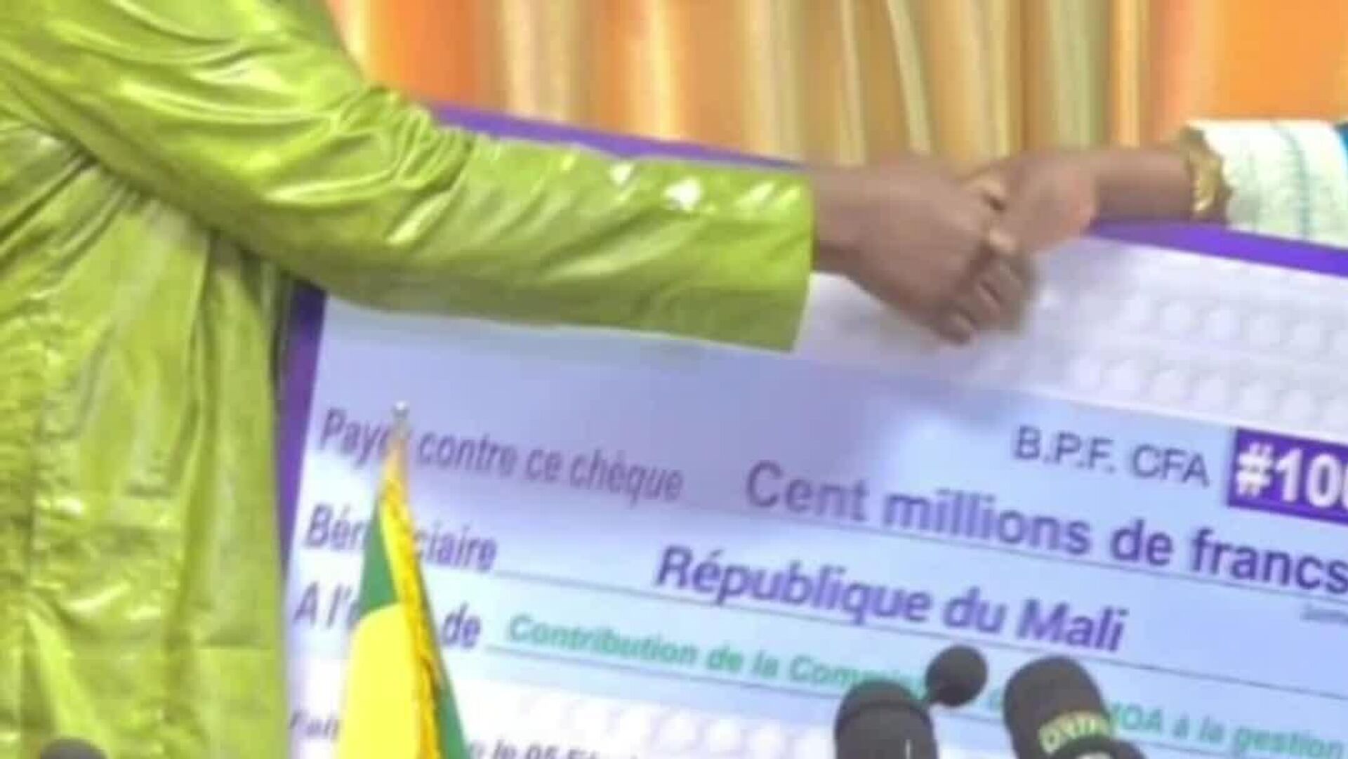 Le chèque a été remis au ministre de l’Agriculture, Daniel Siméon Kelema, selon un communiqué du ministère malien.