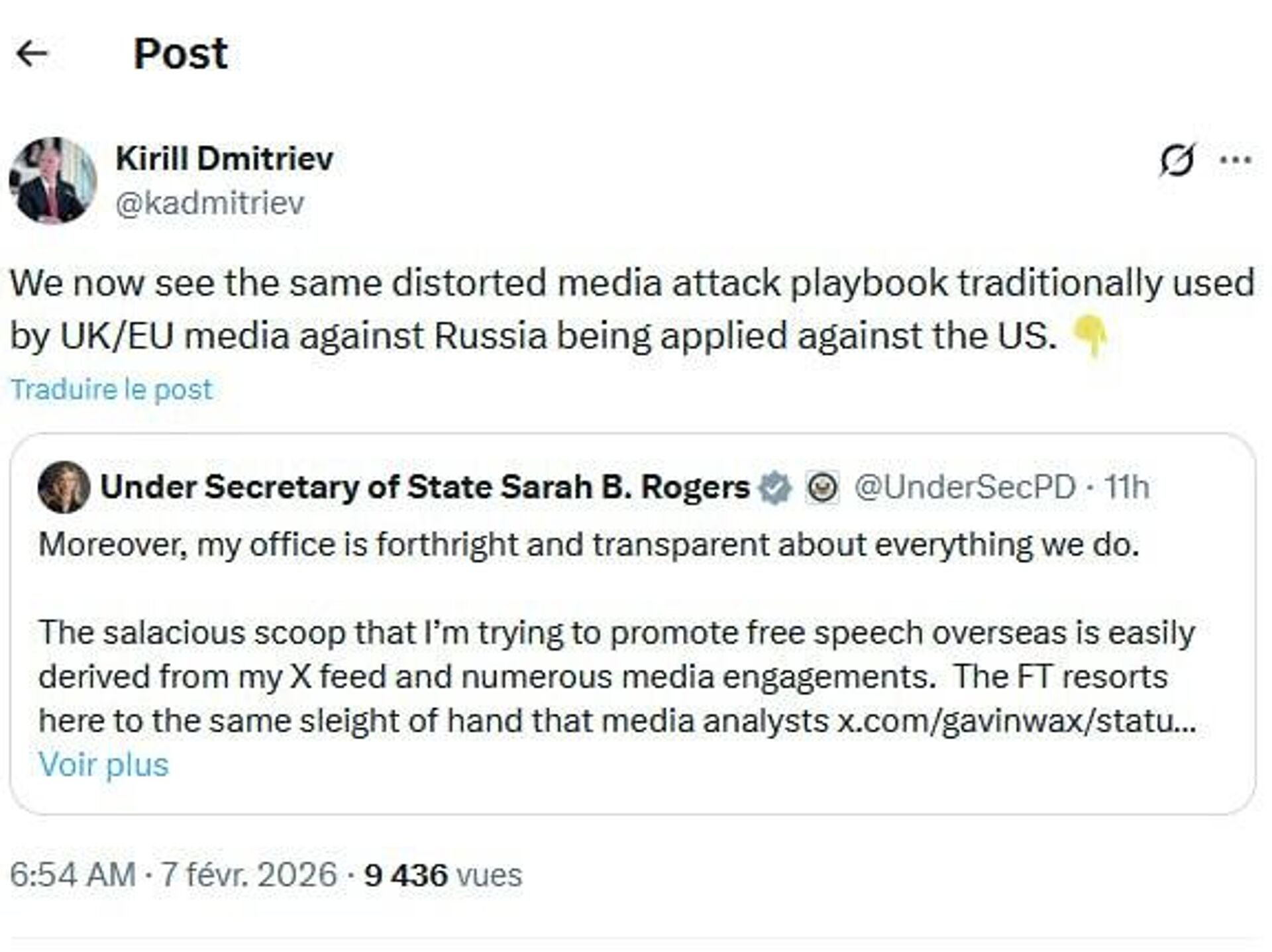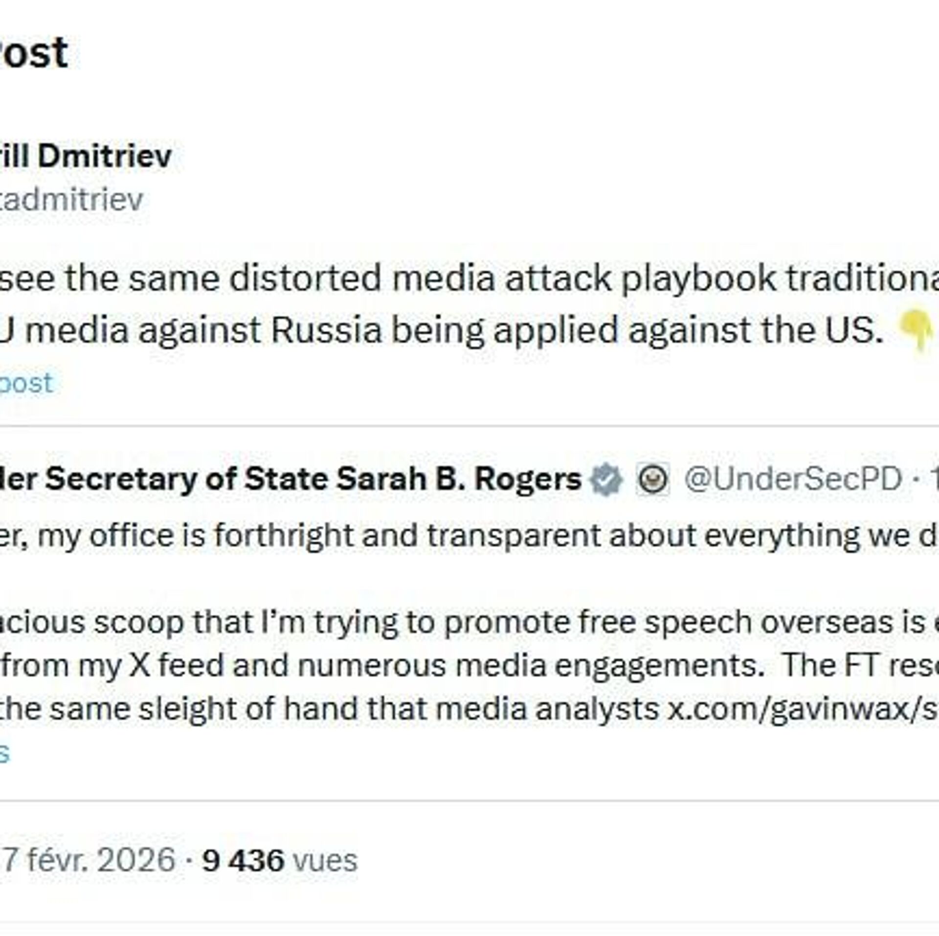 Kirill Dmitriev a réagi ainsi à une publication de Sarah Rogers, haute fonctionnaire du Département d'État. Celle-ci a accusé le Financial Times de déformer les informations dans un article selon lequel le Département d'État américain prévoyait de financer des groupes de réflexion européens liés au mouvement MAGA afin de promouvoir la position de Washington.