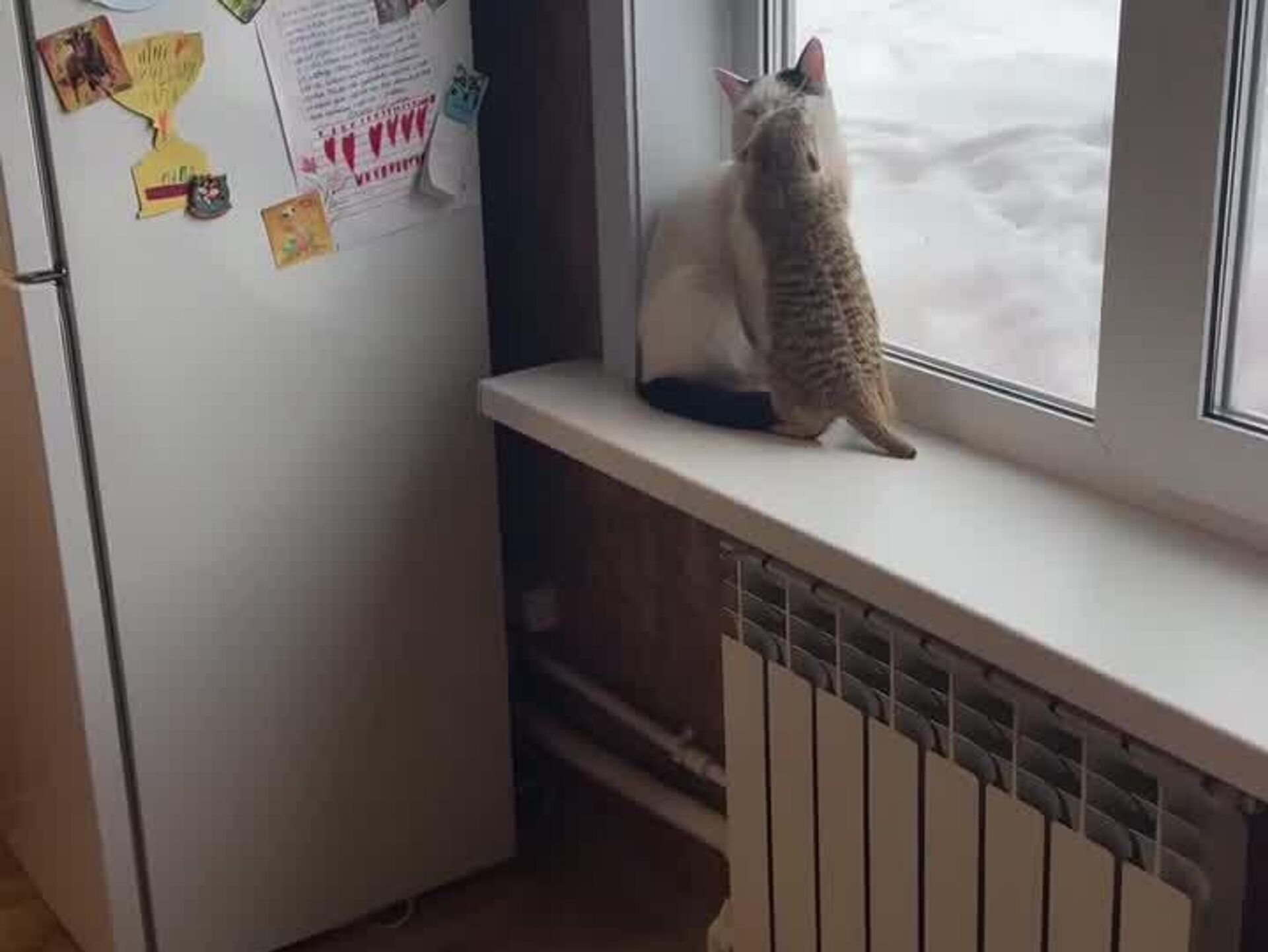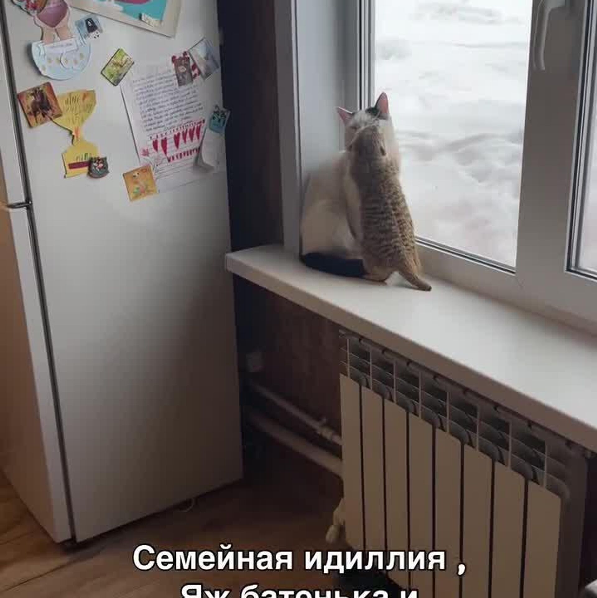 Le suricate fait du body-contact intensif sur le rebord de la fenêtre, le chat subit avec la dignité d’un martyr félin.