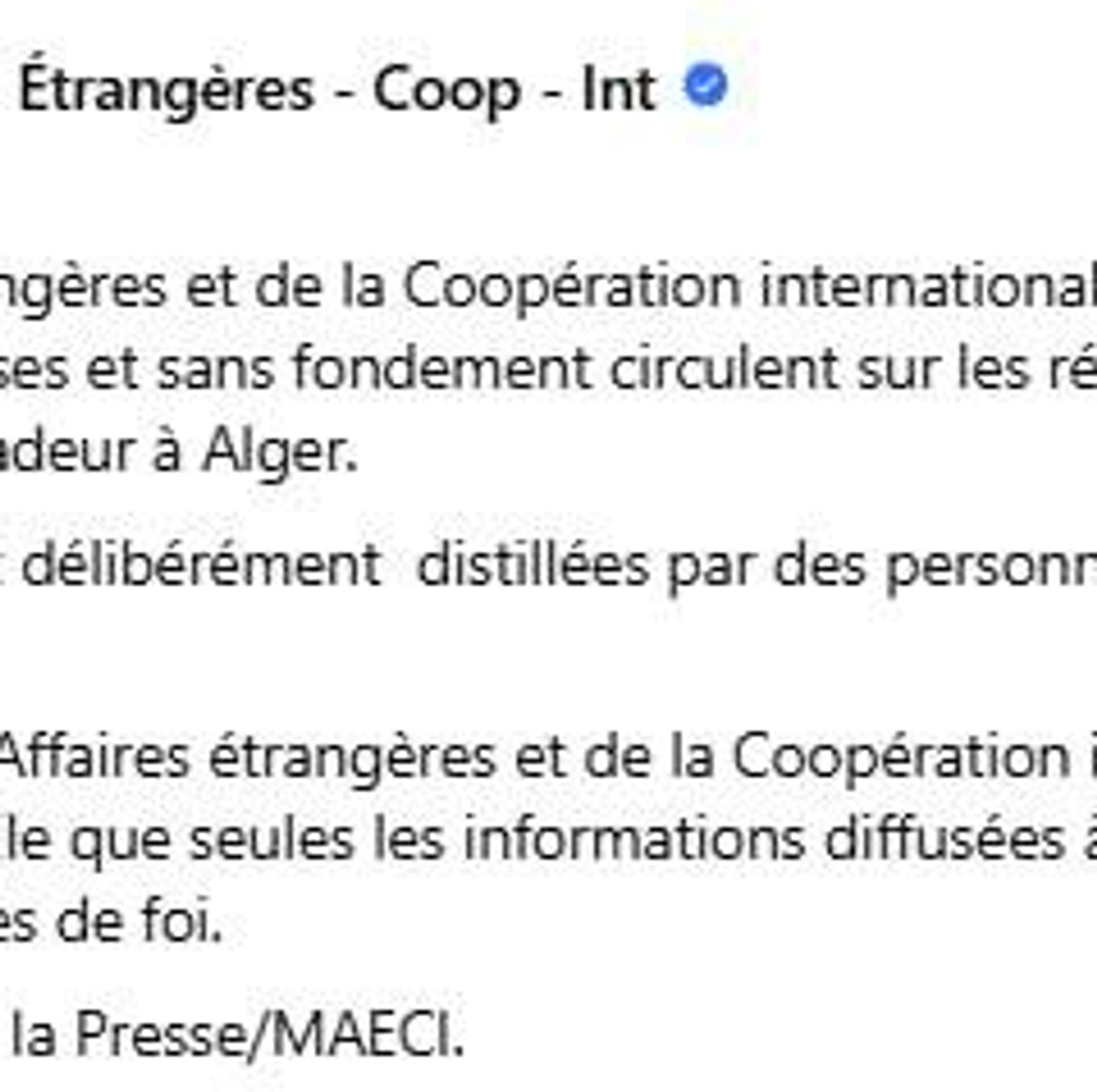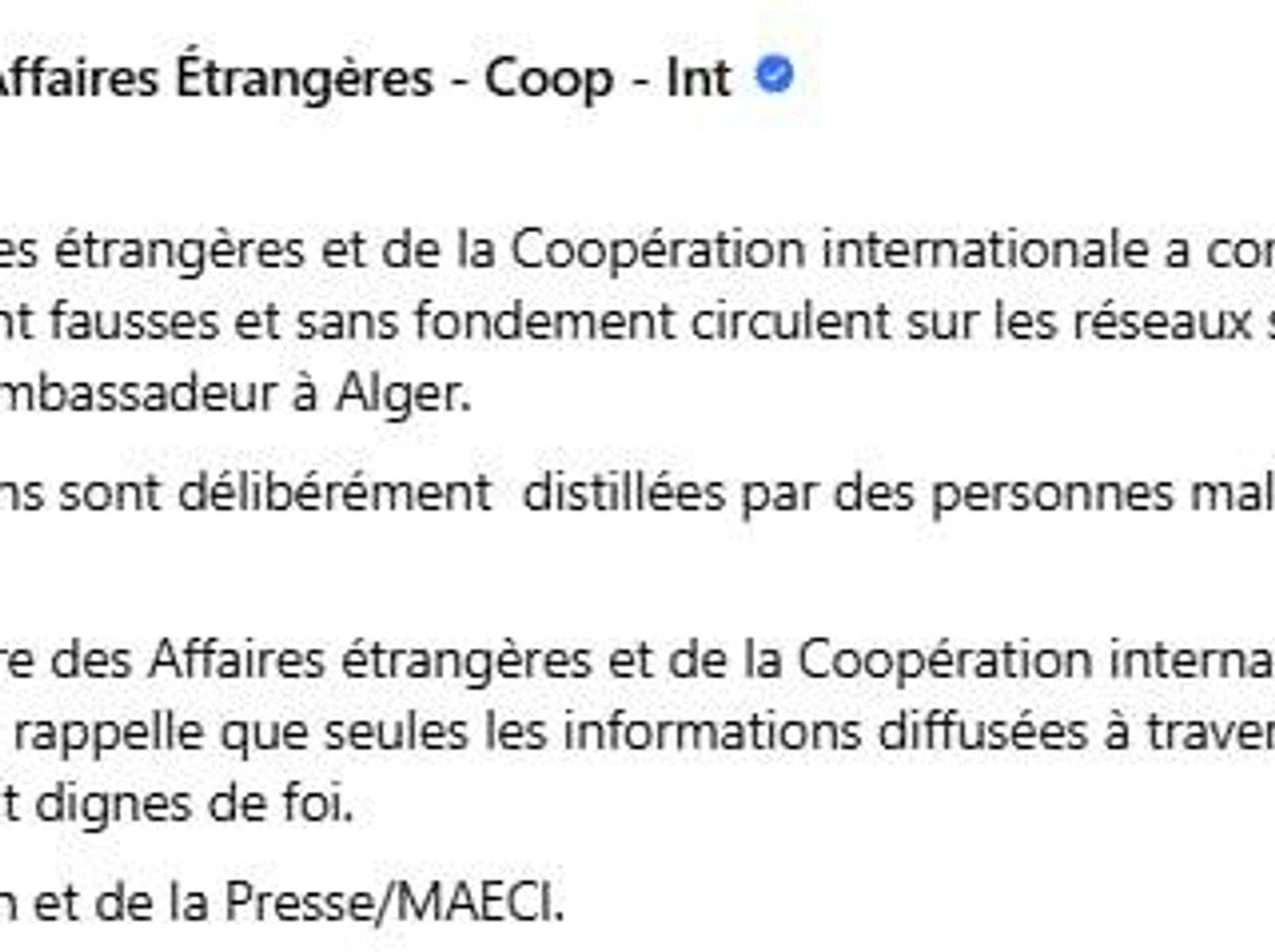 Ces rapports "sont délibérément distillés par des personnes mal intentionnées pour semer la confusion", a rapporté le ministère des Affaires étrangères et de la Coopération internationale.