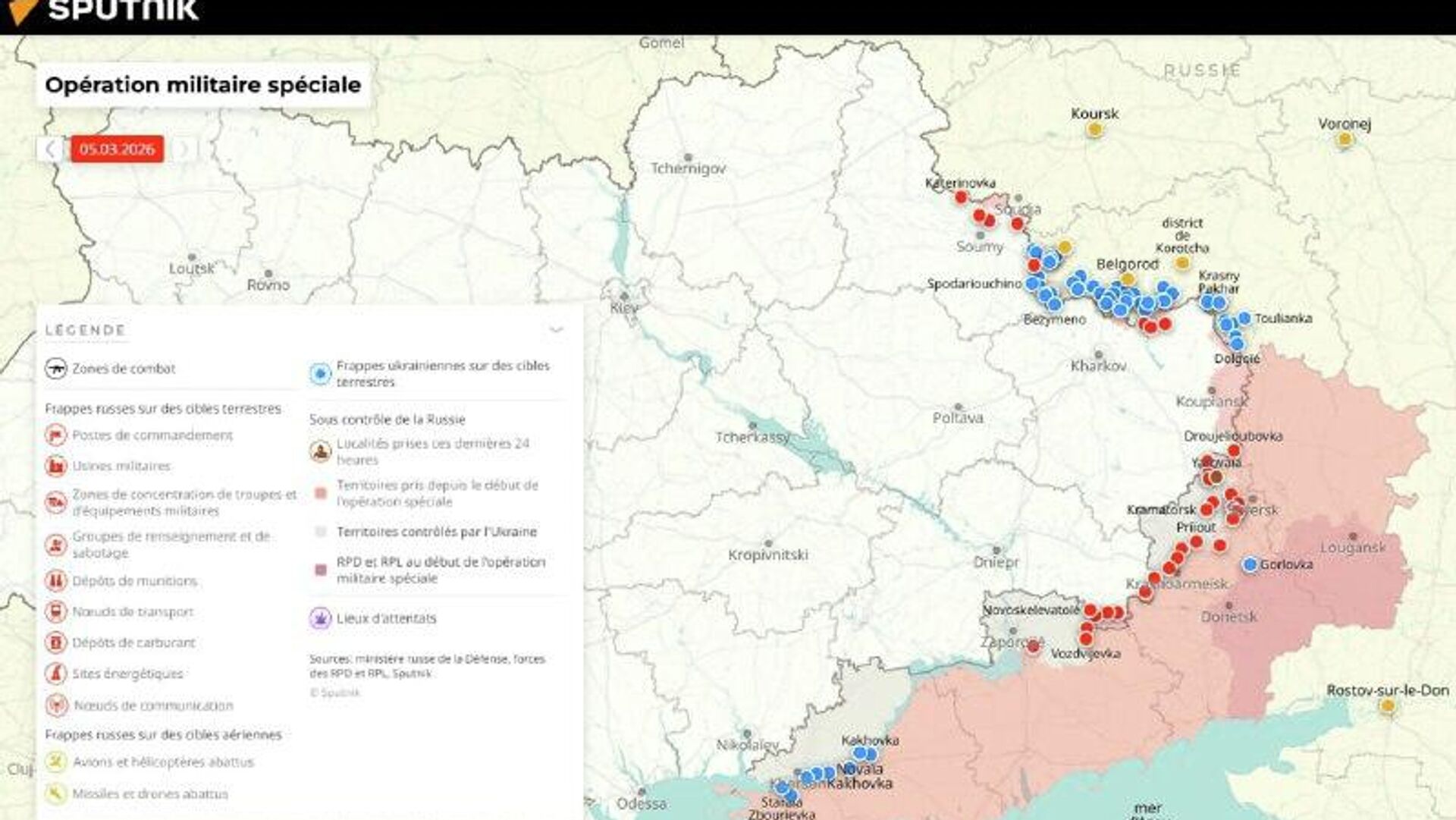 Situation dans la zone de l'opération militaire spéciale russe au 5 mars Pour en savoir plus sur l’emplacement et l’avancée des troupes, consultez notre... 05.03.2026, Sputnik Afrique