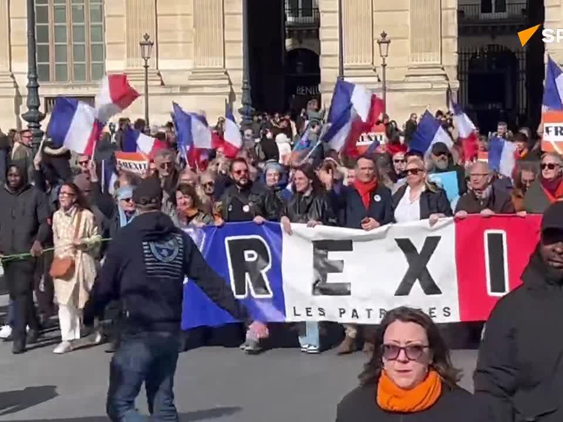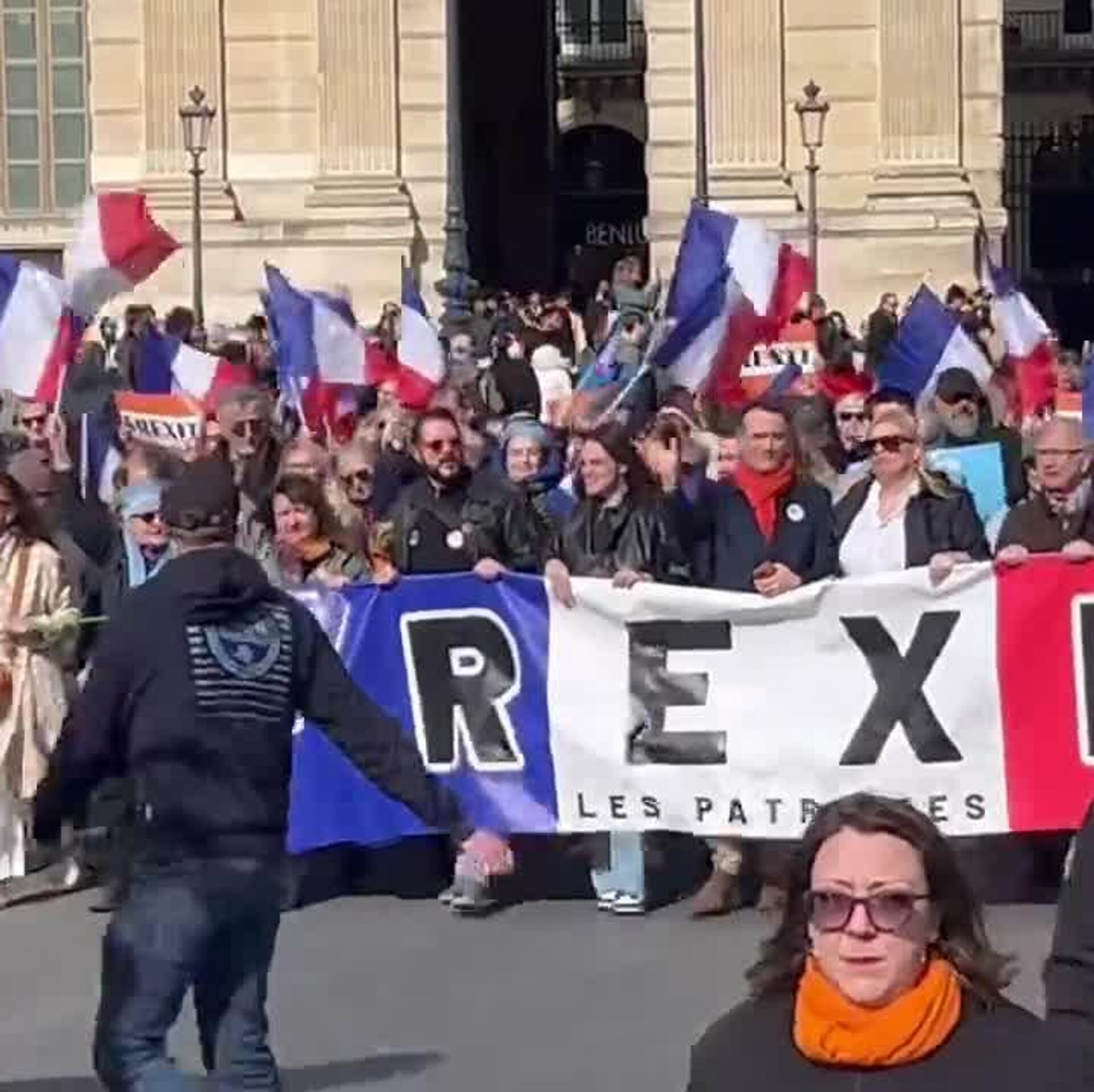 "Nous voulons nous débarrasser de ce drapeau de l'imposture! Frexit!", a déclaré Florian Philippot, dirigeant du parti Les Patriotes, en jetant un drapeau de l'UE du haut de sa tribune.